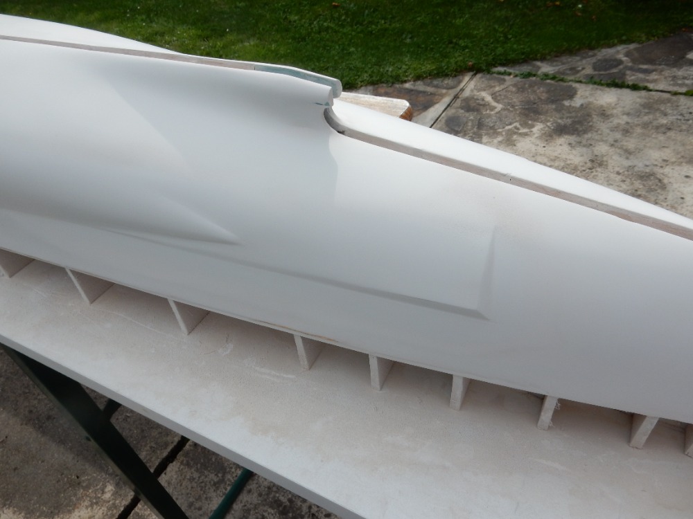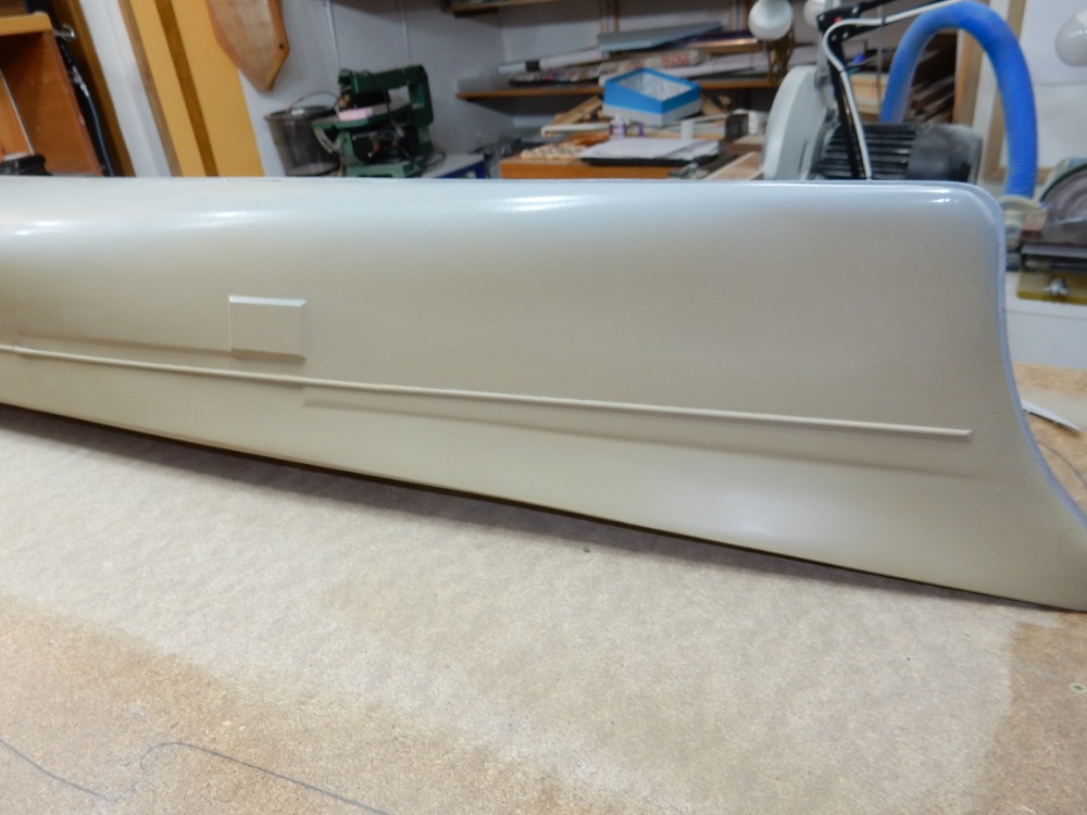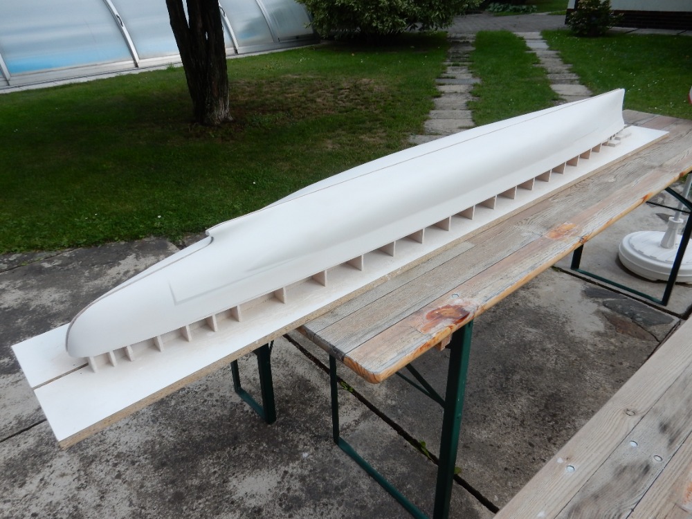 Obrázkem 1 začnu tam, kde jsem minule skončil. Trup je zatmelen stěrkováním, obroušen do patřičných linií, opět nalakován epoxidovou pryskyřicí LH 160 Havel a obroušen „pod vodou“. Nyní jsem aplikoval první vrstvu stříkacího tmelu. Jako u spousty jiných věcí má každý modelář v různých nástrojích a materiálech své favority, já mám ve stříkacích tmelech FINIŠ. Tmel je dvousložkový, polyesterový, české výroby. Výrobce je POLYKAR. Barva bílá, nebo šedá. Poměr míchání 100 : 5. Doba zpracování 45 min. Nepřilnavost prachu po 60 min, doba schnutí 120 min. Cena 243,- Kč včetně DPH za 1 kg. Tmel lze ředit i ředidlem nitro, ale není to ono. Na čištění pistole bez problémů, ale ředím radši originálním polyesterovým ředidlem. Já používám THIN 880 od firmy NOVOL. Cena je sice 100,- Kč za 0,5 litru, ale ředí se poměrně málo, tak vydrží.