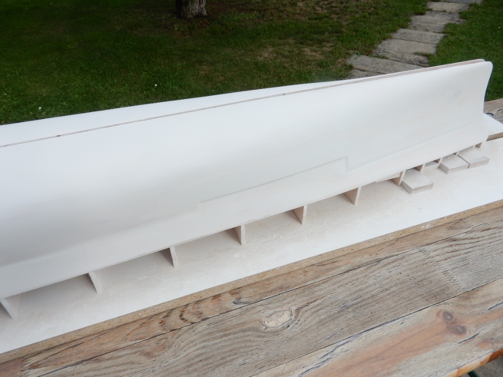 V tomto okamžiku dostává trup první nástřik barvou. Výrobce tmelu FINIŠ uvádí možnost použití jakéhokoli druhu barvy nebo plniče. Nevolil jsem nitro. Brzy schne, ovšem při tomto měřítku trupu až moc rychle. Volil jsem syntetiku, šedou, vysoký lesk. Plnič jsem zavrhl, možná jsem neměl. Trup jsem před nástřikem odmastil lihem. Nástřik proběhl krásně, barva schne dlouho, ale nádherně se rozlila. Ovšem po zaschnutí jsem pozoroval mikro bublinky v povrchu barvy. Po zaschnutí jsem obrousil pod vodou a dal druhý nástřik. Na obrázcích 12 a 13 je výsledek. Myslím, že dostačující.