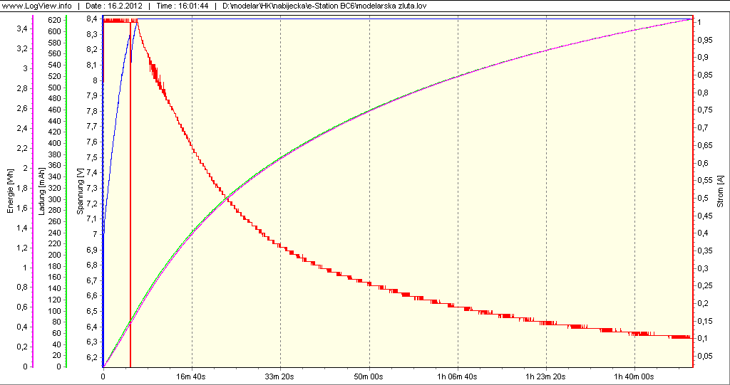 Po vybíjecím testu jsem ji ještě do mrtva vybil proudem 0,1 A, protože se samozřejmě trošku vzpamatovala. Po vybití následovalo nabíjení. Dodaná energie nabíjením byla 3,5 Wh, 623 mAh.