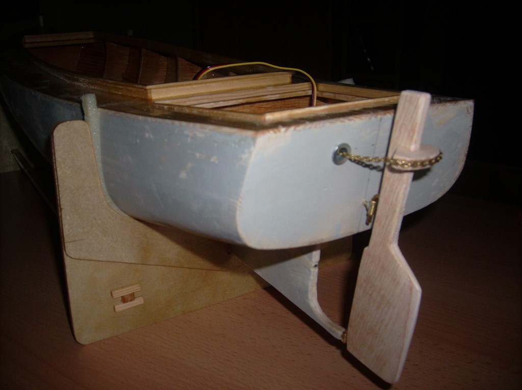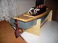 Trup modelu má celkovou délku 77cm, tedy o 10cm více než předešlý. Je postavený stejně, žebra a kýl z překližky 5mm a plaňky 2x5mm. Strojek jsem posunul duzadu oproti nákresu, takže zmizelo kormidelní kolo. Detaily (úvazníky a záchranná kruh) jsem vynechal, loď je stejně s tímto kotlem a pohonem maketově úplně mimo. Barevnou úpravu jsem volil co nejjednodušší. Dával jsem si pozor hlavně na materiály použité na stavbu trupu, protože se během jízdy i on celkem dost zahřívá. Kormidlo se ovládá řetězy s pružinami. Hřídel vrtule je mosazná samorobka, v model. prodejně nic vhodného neměli a tak jsem to spatlal sám. Převod je do pomala 2,6:1 ozubenými koly. K ovládání používám neustále dvoukanálovou soupravu s amplitudovou modulací.
