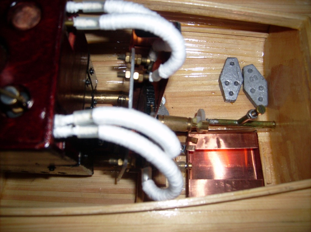 Až po první zkoušce jsem začal věci dodělávat. To proto, abych věděl, jaký budou mít vliv na rychlost jízdy. Jako první jsem omotal vedení páry bavlnou. Rychlost se nezměnila, ale byla stejná i při špatném počasí. Potom jsem přidal parní přehřívače. Jsou to pouze čtyři mosazné trubky s vnitřním průměrem 2mm jednoduše protažené topeništěm. Rychlost se podstatně zlepšila, velice se snížila kondenzace a trup se přestal ničit tryskající parou. Měl jsem strach, že se budou ničit silikonové hadice, ale nic se jim nestalo (jsou moc blízko k topeništi, ale jinak to nešlo). Kondenzační nádoba, kterou jsem udělal předem je s přehřívači zbytečně velká, můžu ji zmenšit až trojnásobně. Zpátečku jsem neřešil.