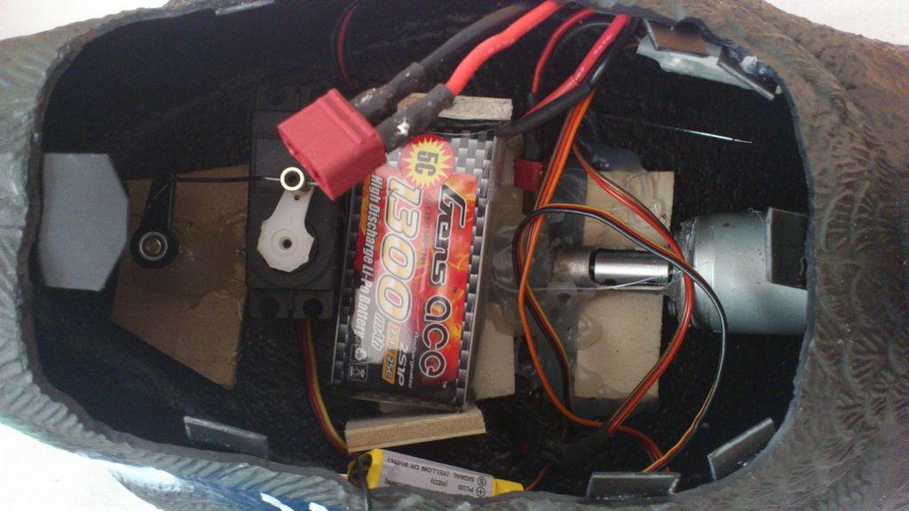 O energii se stará lipolka 1300 mAh/7,4 V a signál zajišťuje přijímač REX5 od JETI. Krom akumulátoru a hřídele jsem vše vydoloval ze šuplíků. Pouze kompletní trup jsem si koupil.