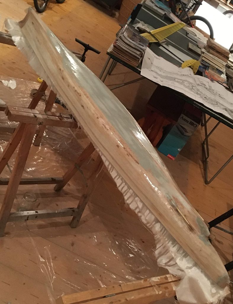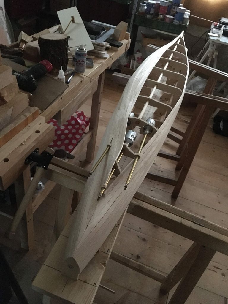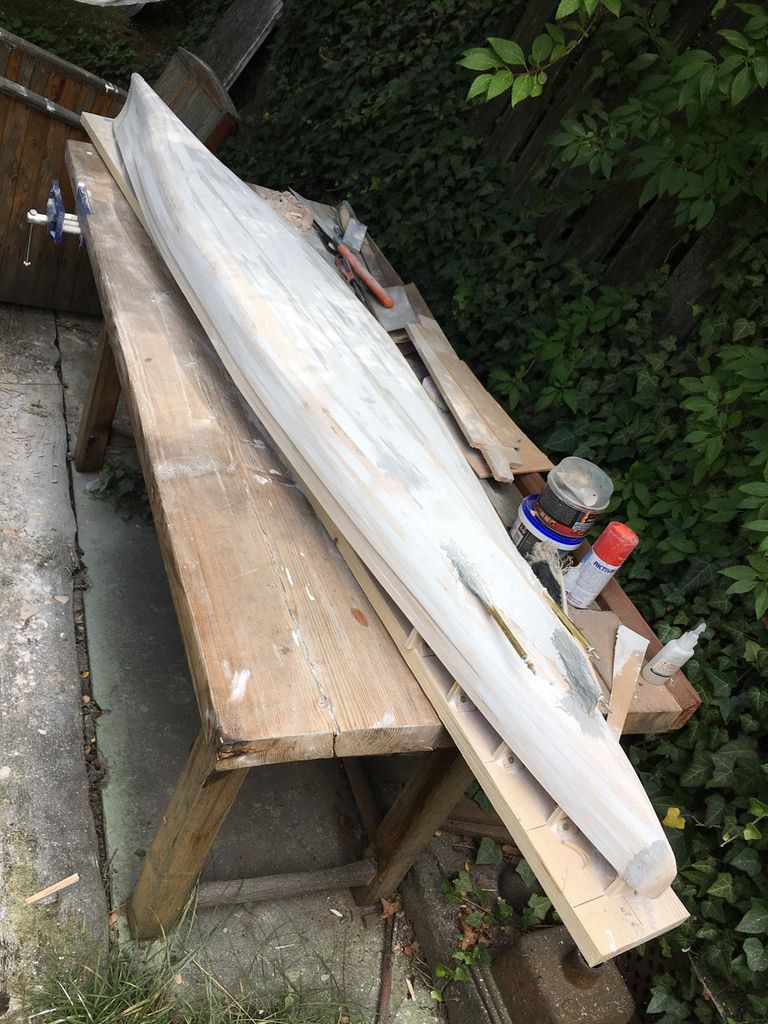 Samotná stavba již probíhá klasicky: překreslit žebra na překližky tl. 8 mm, svrtat otvory pro nosné kulatiny a celou kostru umístit na pracovní desku – v mém případě spíš pracovní fošnu. Následně došlo k umístění hřídelí a motoru. V modelu jsou tři kusy MIG 500 Turbo 12V na hřídelích MP JET s přírubou – dle mého nejjednodušší a nejspolehlivější řešení. Asi nejoblíbenější část stavby následuje– oplaňkování balsou tl. 4 mm, po kterém loď konečně dostane tvar. Posléze nahrubo zatmeleno, obroušeno a přes balzu dvě vrstvy lamina. Pak přichází naopak nejneoblíbenější část – tmelení a broušení.