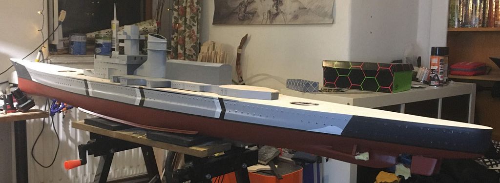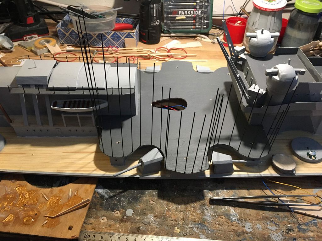 Když bylo potvrzeno, že loď plave a pluje, pustil jsem se do vrtání a osazování okének (cca 170x na každé straně) dále nahrubo připravená paluba a začátek formování nástaveb. Od začátku bylo jasné, že se věže budou otáčet – proto je pod každou věží umístěno servo s rozšířeným úhlem otáčení na 270° a zpomalovačem.
