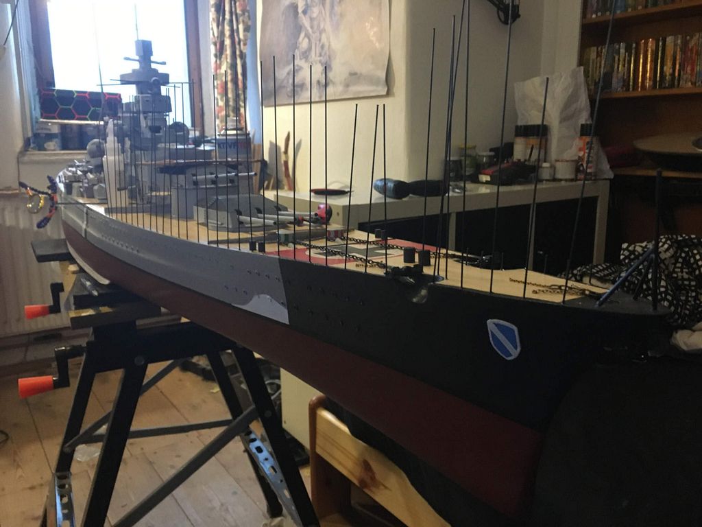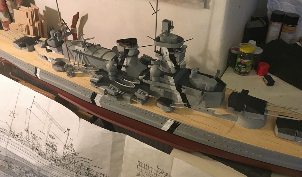 Když loni na jaře začala tahle bláznivá doba, bylo jasné, že budeme spoustu času trávit doma. Z toho vyplynulo rozhodnutí zas se pustit do stavby něčeho „většího”. Po stavbě IJN Mogami (už jsou to tři roky od dokončení) padlo rozhodnutí na stavbu lodi Scharnhorst. Měřítko bylo jasné 1 : 115 – jako Mogami, z čehož vychází celková délka cca 205 cm. Plán jsem měl doma již nějakou dobu schovaný, bohužel jen v měřítku 1 : 200. bylo nutné nazvětšovat žebrorysky (při délce 2 m+ vychází šířka na cca 30 cm).