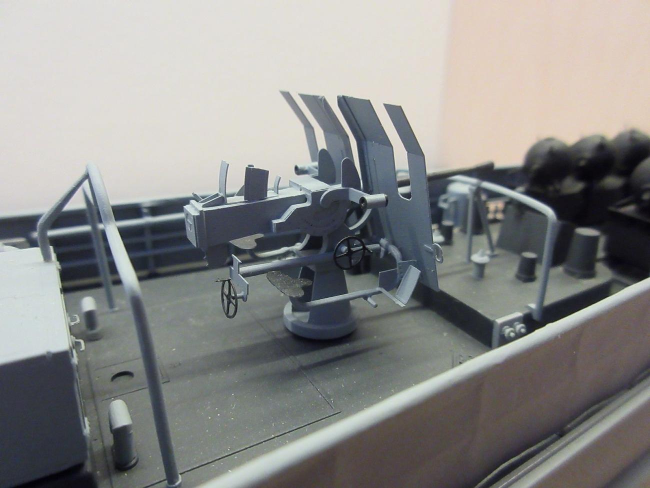 Poslední etapou byla zadní paluba a také sestavení veškeré výzbroje. Zde byla užita naprostá většina leptů, hlavně na palubních zbraních. S lepty lze při sestavování pracovat několika způsoby. Můj nejoblíbenější je lepty navzájem letovat a teprve poté plastové díly k leptům (anebo na lepty) lepit – řídkým kyanoakrylátovým (sekundovým) lepidlem. Poté byla aplikována barva také na zadní palubu a tam, kde jsou dřevěné rošty, jsem použil techniky suchého štětce a vhodné světlejší „dřevěné“ barvy.