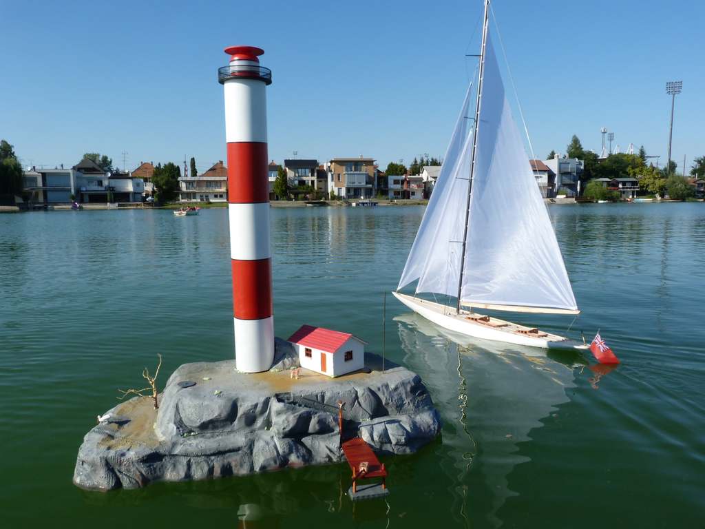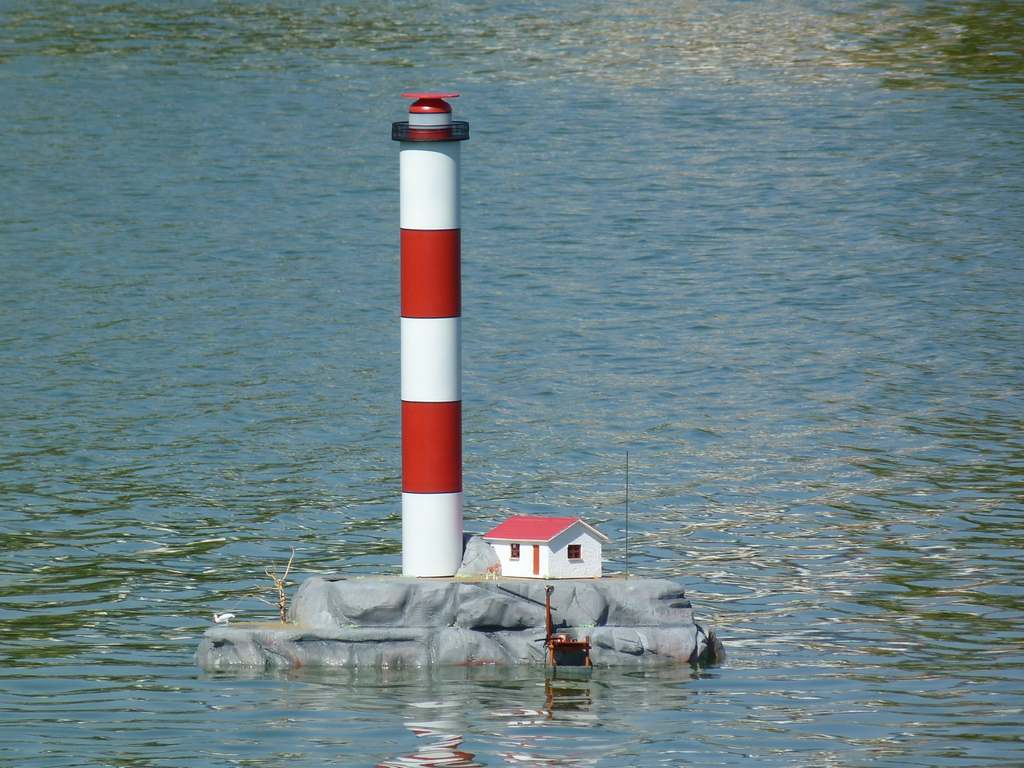 Po niekoľkých dňoch mi Juraj predstavil náš vlastný ostrov s malým domčekom pre jeho strážcu a údržbára majáka. Bol vyrezaný zo styroduru 120x60x20cm a krásne vierohodne nastriekaný do podoby skaly, v strede mu dominovala 140mm diera, kam mal zapadnúť náš majáčik. K nemu sa časom pridali aj boje z tvrdých plastových laboratórnych fliaš za ktoré vďačím mojej kolegyni Mirke. Nasledovalo odlievanie olovených kotiev na boje a ich príprava. Samotný plávajúci ostrov je ukotvený na dne dvoma 10kg kotvami z veľkej fľaše naplnenej štrkom a vyvažovaný 5kg podvesnym závažím. Na kompletnej elektrifikácii osvetlenia ostrova sa podieľal tiež Juraj.