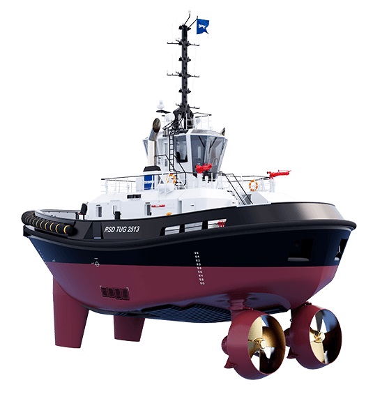 Přesto jsem zvolil remorkér SENGLEA - RSD 2513 (2019). Při hledání na internetu se mi podařilo najít na stránkách provozovatele vektorové pdf v měřítku 1:50. Koncepce RSD je navržena jako špičkový remorkér pro manipulaci s lodí během pomoci na zádi a přídi plavidla vplouvajícího do přístavu. Pro třídu RSD 2513 exitují dva typy lodě. Ten starší je vidět na videu dole - na bocích nástavby má extra otvory pro sání motorů, má jinak tvarované komínky a jinde vstup do kormidelny. Také má nižší výkon a menší průměr dýz.