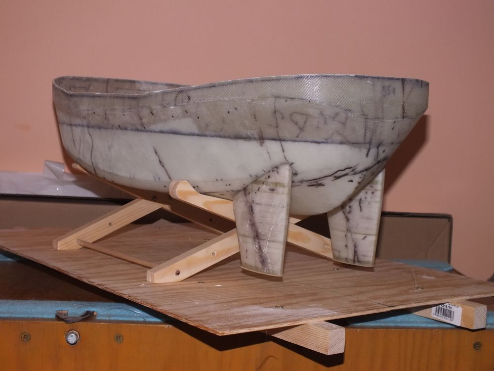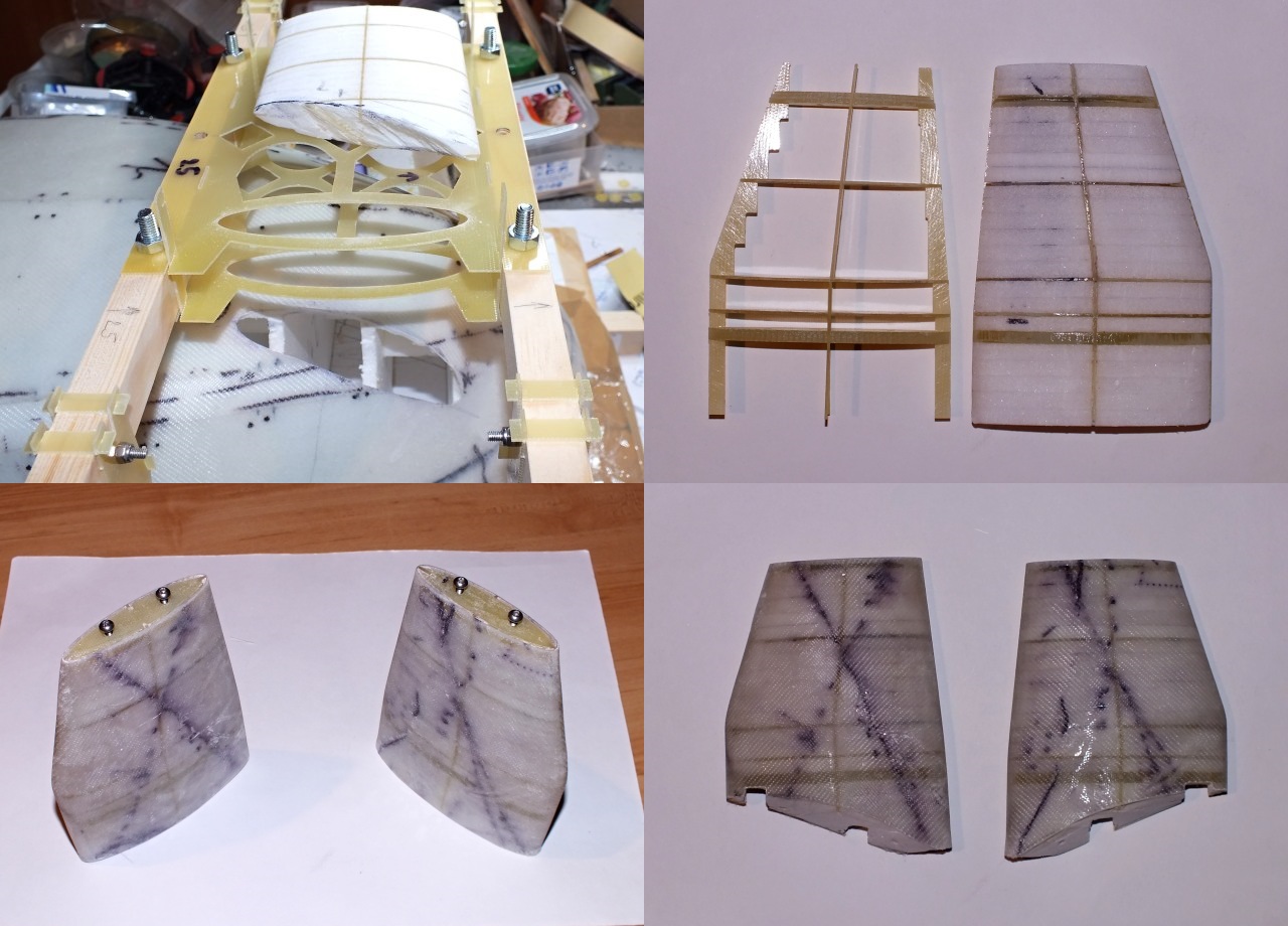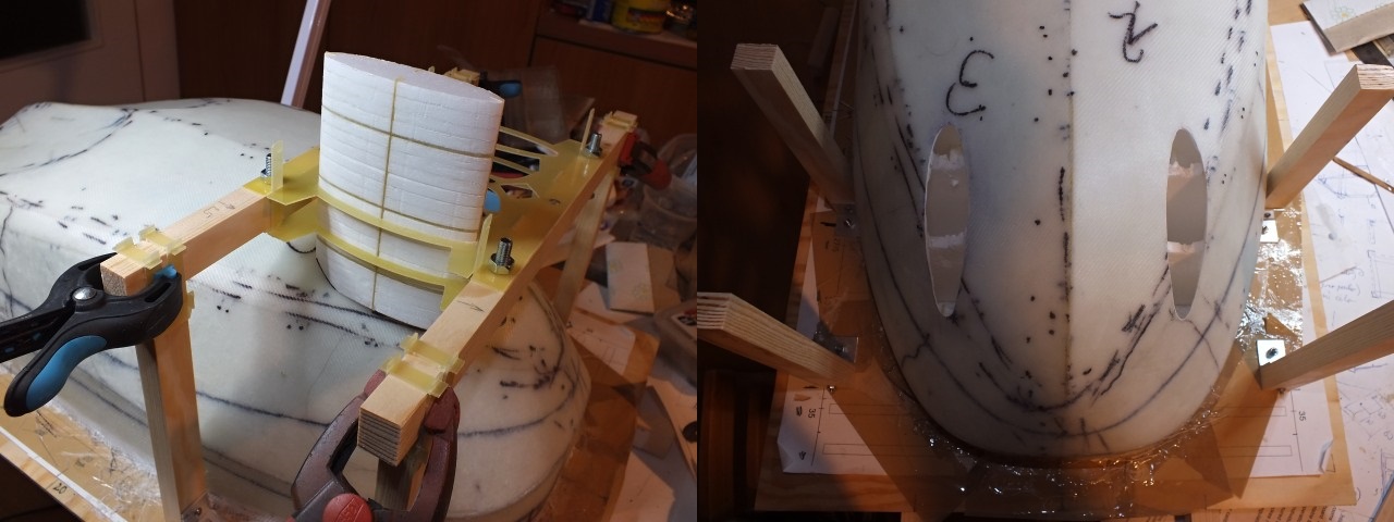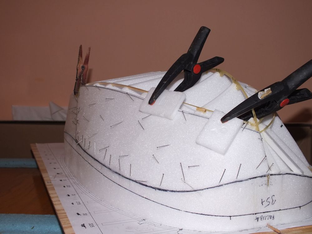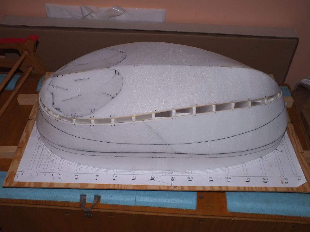 Kopyto bylo vytvořeno z Depronu. Žebra jsou z tloušťky 6 mm, rozteč žeber je 37 mm a 15 mm ve zhuštěné části na zádi. Obšívka je z tloušťky 3 mm. Složité tvary jsem přenášel pomocí novinového papíru. Hodně mi to připomnělo plaňkované trupy. Práci jsem si fakt užil. Trup v kolmé části byl úmyslně protáhnuty až k montážní desce, při odříznutí tak vznikla neměnná tloušťka vrstvy laminátu.