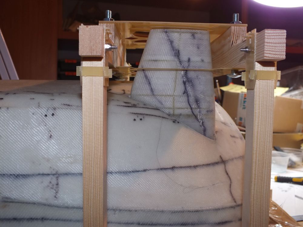 K laminování jsem použil Letoxit (epoxidový laminační systém LETOXIT® PR102 + EM420). Laminování bylo skelnou tkaninou 163 g/m2 a 110 g/m2, obě v keprové vazbě 2/2 12x12/cm. Vnějších vrstvy byly čtyři 2x160 a 2x110. Každá vrstva skelné tkaniny byla z jednoho kusu. Tam, kde by mohly vzniknout přehyby, jsem je odstříhnul. Další vrstvu jsem udělal tak, aby se tyto odstřihnuté části překrývaly. Tím jsem zamezil vzniku přehybů a bublin.