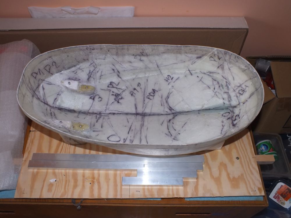 Vnitřní vrstvy byly už jenom tkaninou 160. Celkem jsem dělal dvě až tři základní. Na předek a zadek jsou použity další dvě vrstvy. Před položením vnitřní vrstvy jsem pomocí Perchloretylénu odleptal Depron až k čáře ponoru a také jsem odstranil všechna žebra (bylo pěkné, že se černá fixa obtiskla do laminátu a zrychlila tak následné opracování trupu).