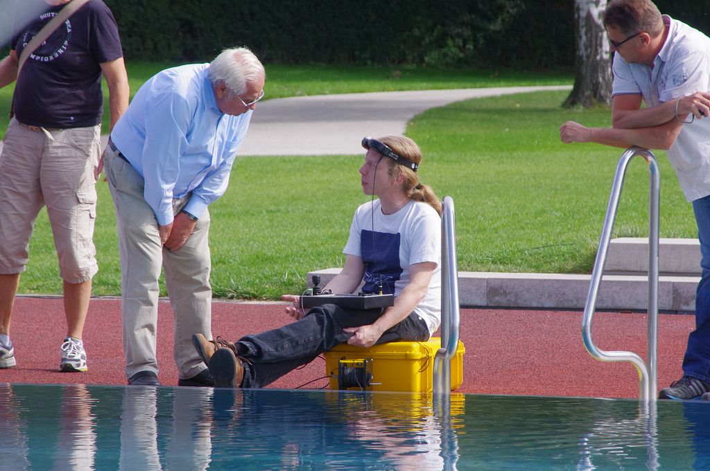 Podstatně sofistikovanějším prostředkem je kabelem řízený ROV (Remotely operated underwater vehicle) známého německého ponorkáře, výrobce a prodejce modelářské techniky, Norberta Brüggena. Na první pohled to tak nevypadá, ale i když je na kabelu, překvapivě snadno sleduje modely do vzdálenosti přes 30 m a lehce manévruje. Norbert na okraji bazénu seděl na kufru, v němž se technika přepravuje, digitálními brýlemi sledoval dění pod hladinou a natáčel, jen občas se nechal vytrhnout ze svého světa pod hladinou, zvedl brýle a odpovídal na všetečné dotazy.