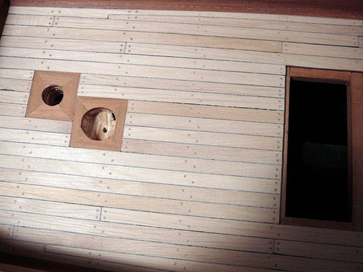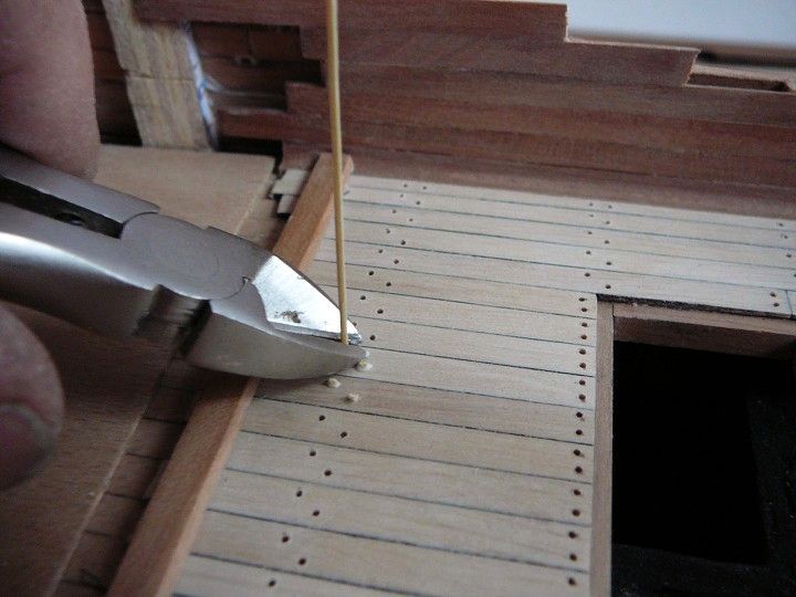 Jednotlivé plaňky lodní obšívky byly ukotveny na žebra kostry dřevěnými kolíky. Tak stejně i paluba. Ve skutečnosti odpovídal průměr kolíků 1/3 síly plaňky, ale maximálně 4,4cm, což u měřítka 1:48 je 0.9mm. Je lepší použít ještě o něco menší průměr pro dokonalejší autentičnost modelu.