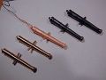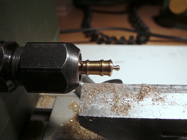Mosaznou kulatinu jsem nahrubo osoustružil do krajních průměrů, podle podloženého výkresu jsem označil místa prstenců a stočil na průměry. Nakonec jsem snížil části hlavně mezi prstenci, vyleštil čtyřstovkou smirkem a vytočil jsem kuličku (Button) na konci děla. Ve svěráku vrtačky doraz,(ti kteří si moc nevěří, si mohou vyrobit pomocné čelisti třeba ze dřeva, do kterých vloží hlaveň děla na vrtání otvoru pro čepy), aby vrtání otvoru pro čepy bylo na všech hlavních stejné, vytočil čepy z mosazné kulatiny a narazil je do hlavní. Pokud by se jednalo o větší počet děl stejných rozměrů, pak by se vyplatilo vybrousit si profilový nůž, ale při deseti kusech, které jsem potřeboval, je to rychlejší od ruky a měřit.