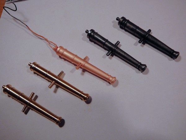 Provedl jsem i experiment s dělem ze stavebnice (tyto bývají často v nepoměru ke skutečným dělům jak rozměrově, tak tvarově). Upravil jsem průměr kulovitého zakončení děla tak,aby odpovídalo skutečnosti. Nacínoval jsem kapku cínu, opracoval a provrtal,čímž jsem vytvořil očko pro provlečení zádržného lana, tak jak bylo zvykem na anglických lodích té doby.