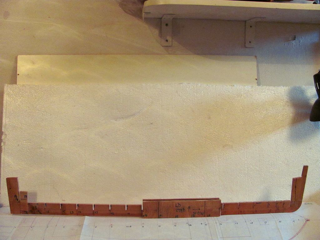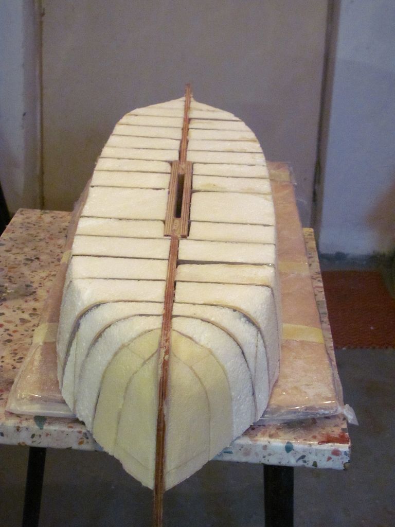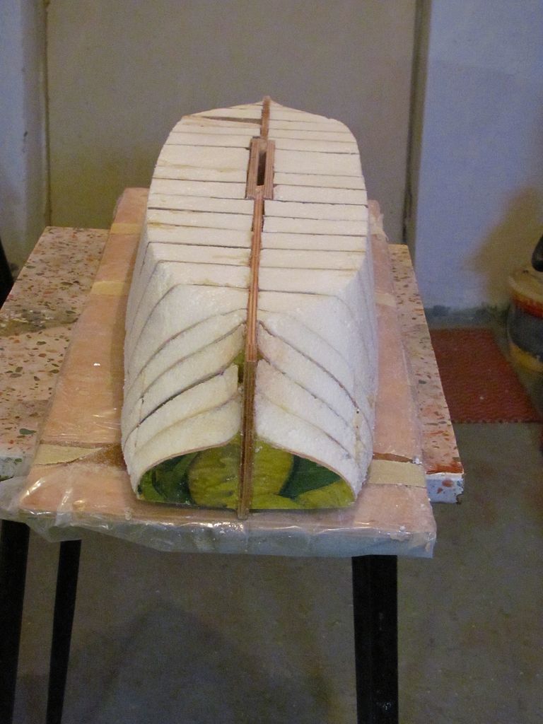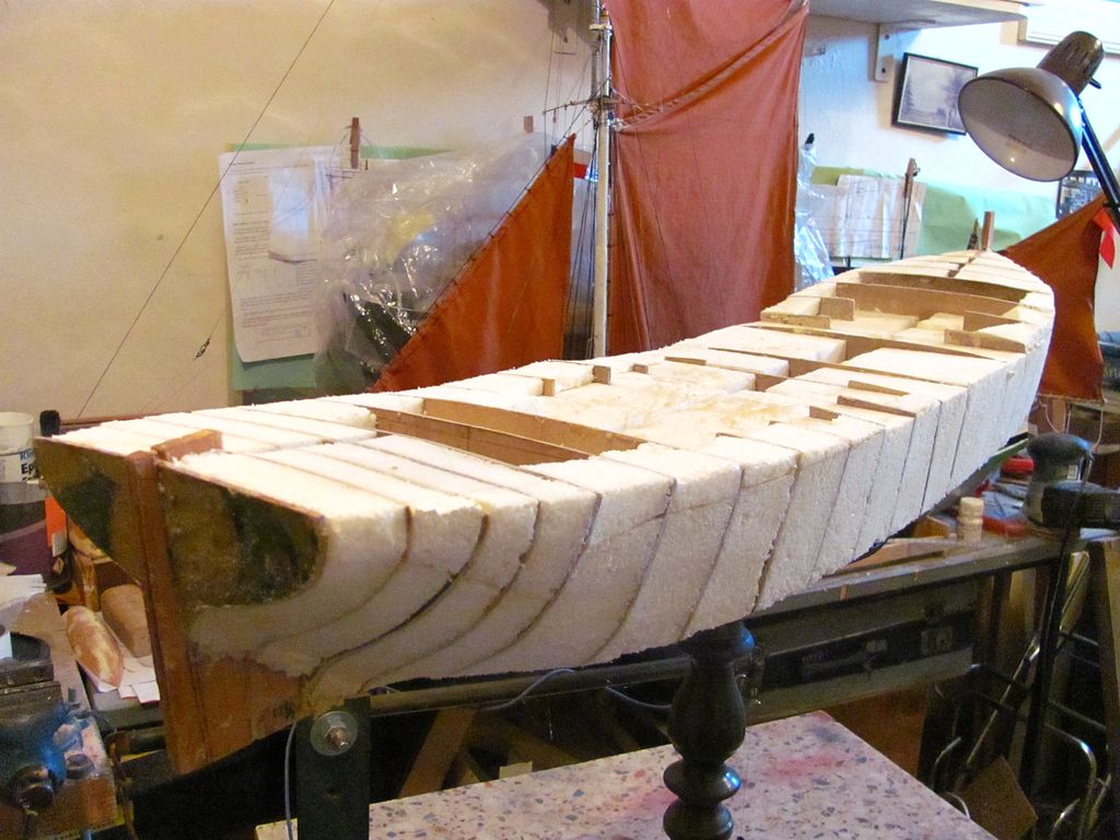 Chtěl jsem ušetřit váhu, a tak jsem už trup nezpevňoval podélně lepenými lištami na bocích a na palubě. Po zatuhnutí lepidla jsem z polystyrenu nařezal kvádříky, které jsem vlepil mezi žebra pomocí polyuretanového lepidla.. Následovalo obroušení přesahujícího materiálu pomocí rašple a velkorozměrového „brousítka”.
