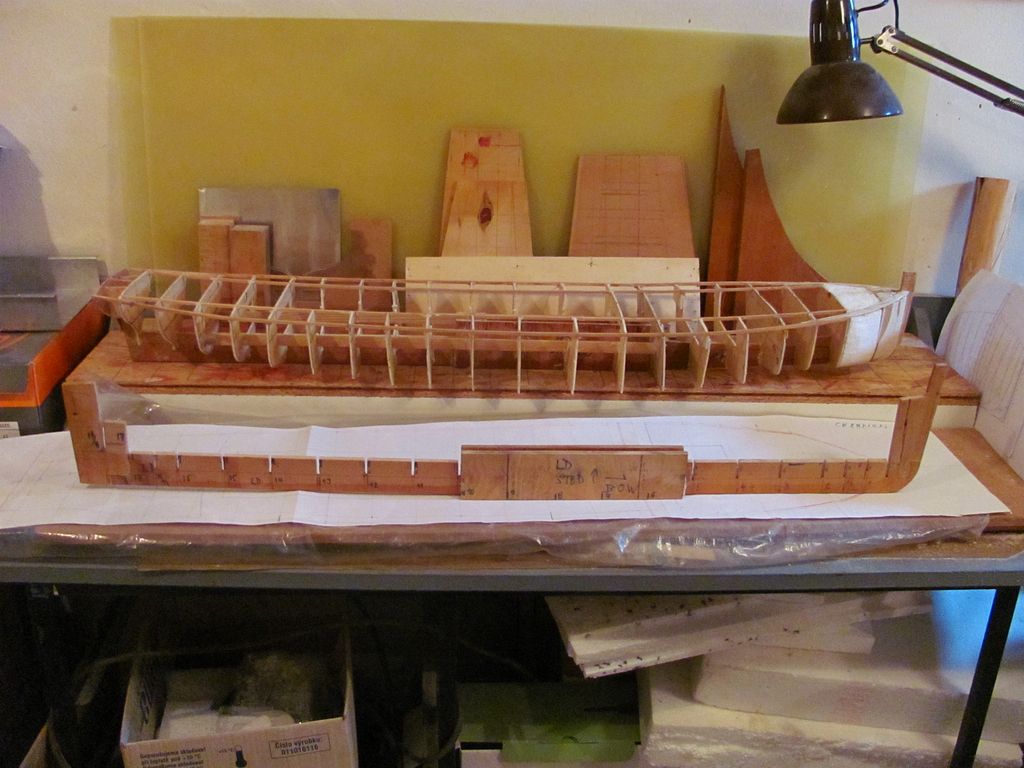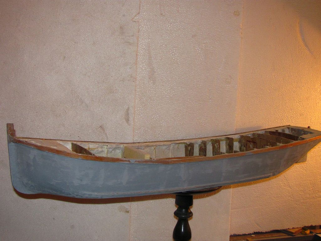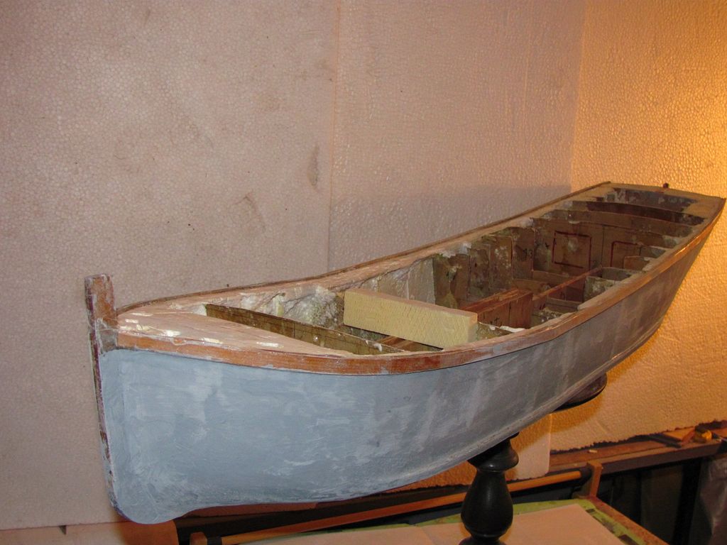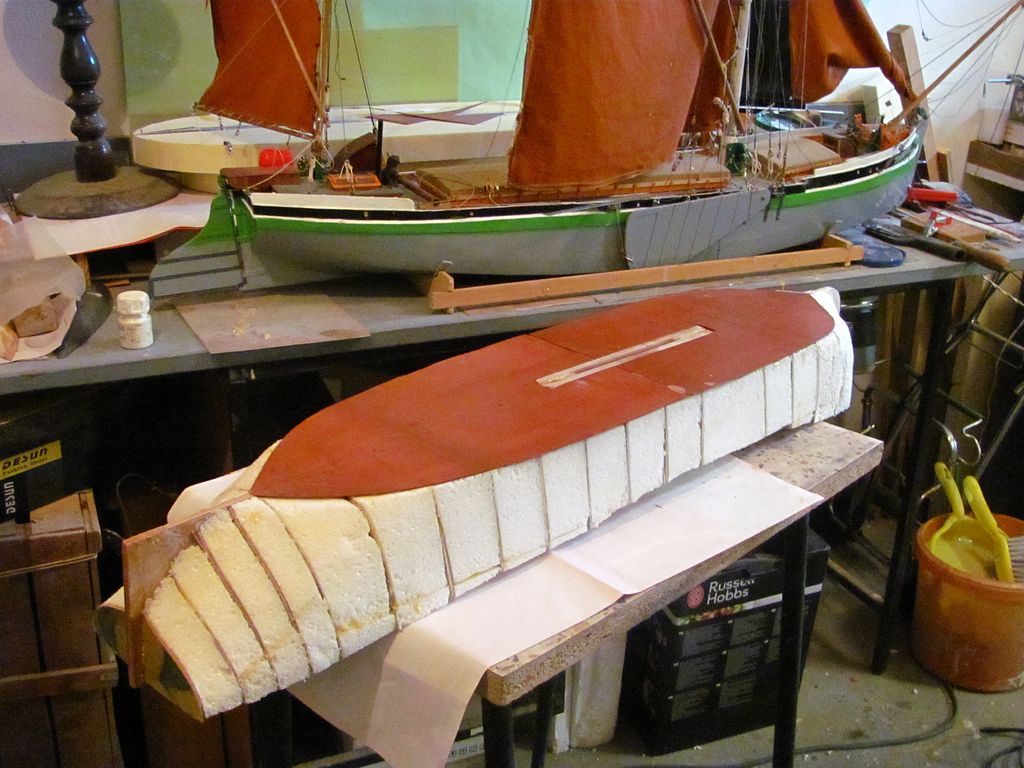 Chtěl jsem ušetřit váhu, a tak jsem už trup nezpevňoval podélně lepenými lištami na bocích a na palubě. Po zatuhnutí lepidla jsem z polystyrenu nařezal kvádříky, které jsem vlepil mezi žebra pomocí polyuretanového lepidla.. Následovalo obroušení přesahujícího materiálu pomocí rašple a velkorozměrového „brousítka”.