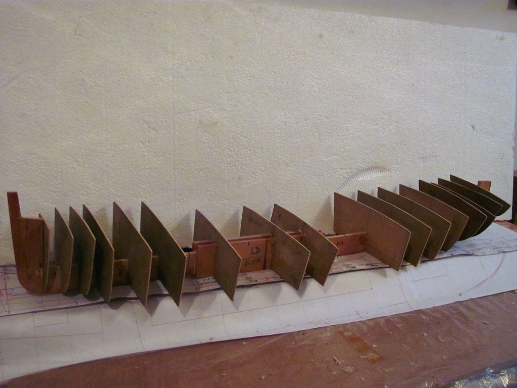 Samotná žebra jsem postupně během stavby vylamoval, abych dostal více místa pro vnitřní vybavení. Na dvou místech jsem musel odříznout i menší části kýlu: na přídi v místě, kam přijde servo kosatky, a ve střední části, aby se dal vhodně napříč umístit gelový Pb akumulátor.