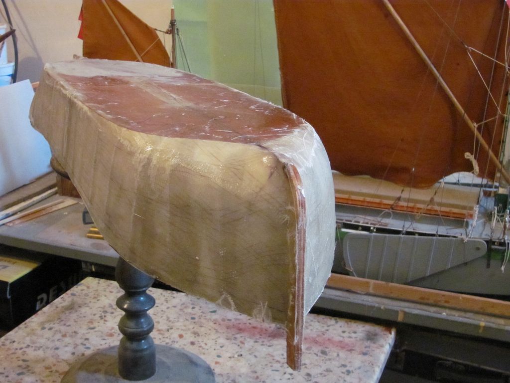 Kvůli zpevnění dna modelu jsem na dno kopyta přilepil prešpánovou vložku, kopírující obrys dna trupu. Tuto jsem napustil zředěným epoxidem. Po vytvrzení následovala laminace 2 vrstev skelné tkaniny 100 g/m2. A potom oříznutí.