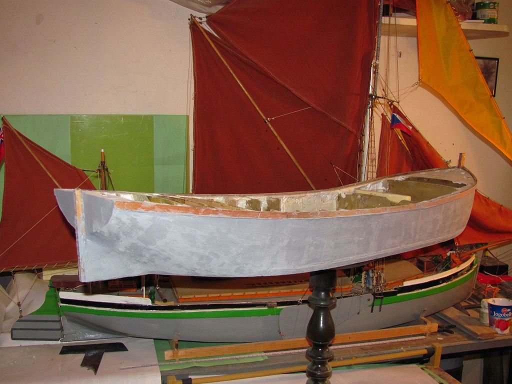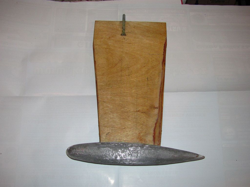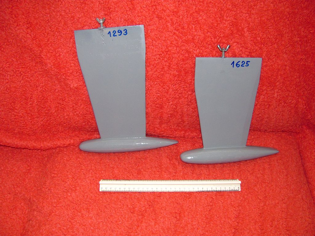 Pro menší model bárky jsem potřeboval udělat nové centrální ploutve se zátěží („bombou”). Pro novou zátěž jsem si vypočítal přibližné rozměry bomby a podle nich jsem vysoustružil kopyto. To jsem zalil sádrou do poloviny a vytvořil tak formu. Po vyschnutí formy jsem ztavil v plechovce dohromady zbytky olova a cínu, ze kterých jsem odlil „od oka” nové dělené díly zátěže, a z těch jsem zhotovil 2 ploutve o váze 1293 g a 1625 g. Kovové díly jsem přilepil z obou stran na dolní část ploutve, přetmelil, obrousil a olaminoval.