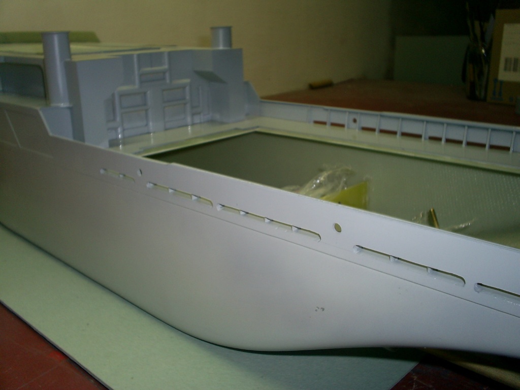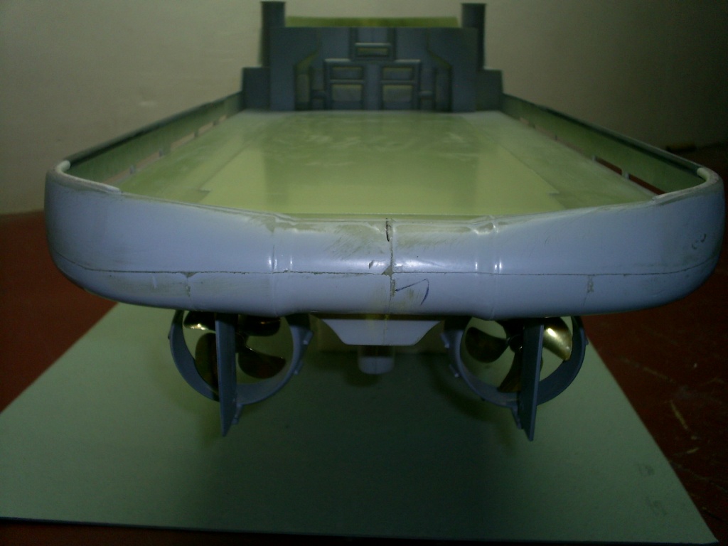 Model je ve fázi základní stavby trupu s „vanovými“ zkouškami výtlaku, těsnosti a funkčnosti příčných a hlavních pohonů. Souběžně se realizuje dřevěné obložení pracovní paluby a konstrukce horní hlavní nástavby.