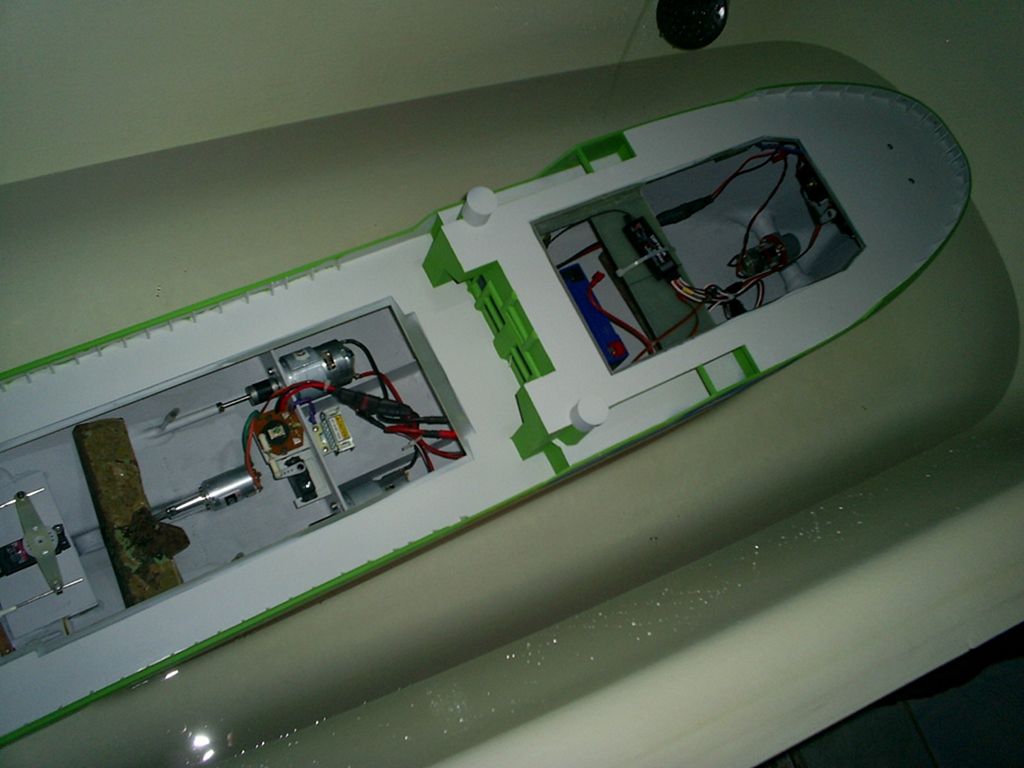 Výtlak lodi na prvních zajížděcích zkouškách (viz fotodokumentace) je cca 12 kg, ale bude dolaďován a dovažován pro ideální vlastnosti o nějaká ta deka.