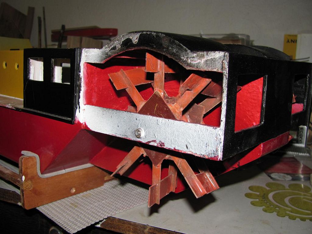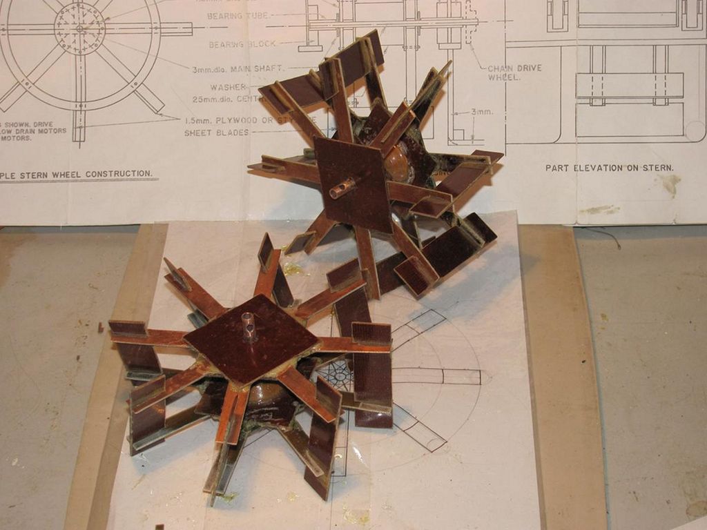 Příruby jak pro kolesa, tak pro motory jsem si musel nechat zhotovit u místního soustružníka. Původně jsem chtěl uložit motory v trupu na zkosení dna na zádi, na oba boky. Šikmé uložení ale značně zkomplikovalo usazení nových motorů, a tak jsem byl nucen dodatečně vložit základnu pro motory „ze sklepa do přízemí” do úrovně první paluby, kde jsem musel proto odříznout vnitřní stěny „přístavku”. Po nasazení řemínků jsem zjistil, že budu muset udělat navíc v základní desce z překližky 4mm zářez, jinak by se řemínky nedaly nasadit. Na tyto dodatečné úpravy jsem si už docela i zvykl. Nic není definitivní, i když to na výkrese vypadá perfektně.
