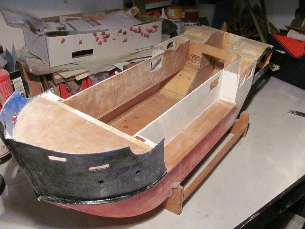 Dno trupu je vyříznuto z 4mm překližky, boky 5mm balza, oblý přechod outorů je tvořen bukovou kulatinou Ø 10 mm. Příď je natvarovaná balzovými špalíčky, obroušena a přetmelena, na zádi jsou přilepeny náběhy pod kolesnice. Výsledkem je dolní část trupu, který je dělený na výšku. Následovalo lepení dolní paluby z pásů překližky a příďového zesílení. Jako další krok bylo olaminování trupu. Měl jsem zbytky tenčí skelné tkaniny, laminoval jsem pomocí CHS Epoxy 1200, což odborníci nedoporučují… lepší je použít přímo laminovací pryskyřici. Pro zpevnění balzového trupu jsem jej napustil Epoxy 1200 silně ředěnou nitroředidlem C 6000. Po vyprchání ředidla tuhla pryskyřice asi týden, ale nakonec zatuhla ke všeobecné spokojenosti… a trup se stal nejen pevnějším, ale také odolným zevnitř proti navlhnutí vodou.