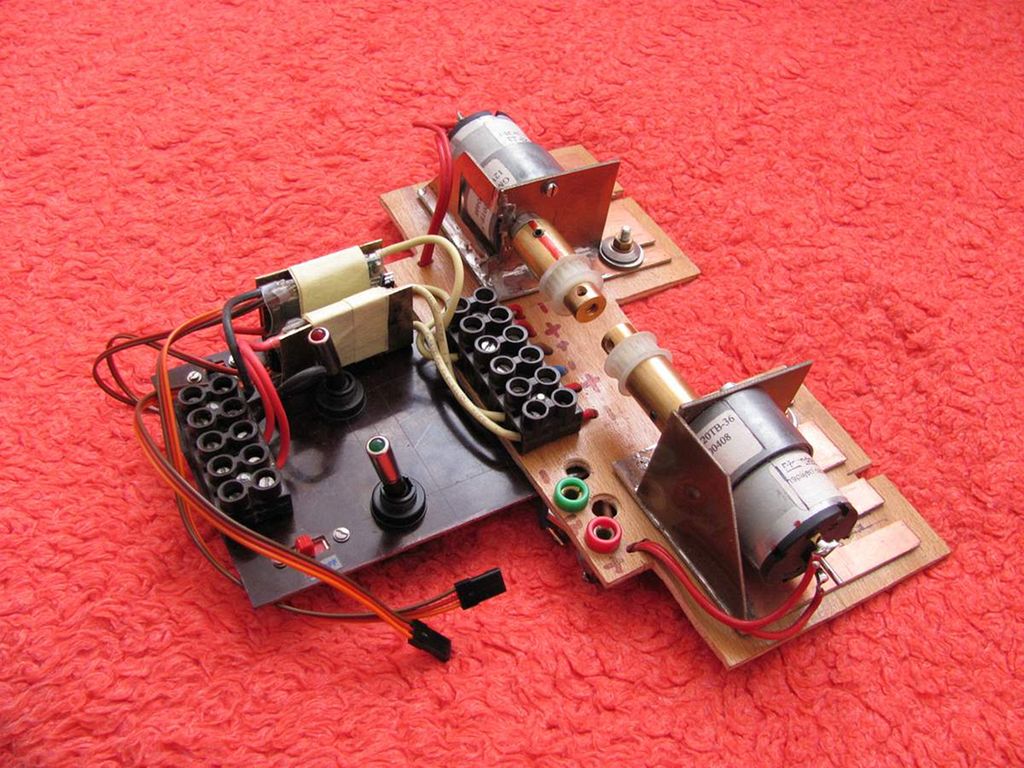 V přestávkách mezi tmelením a broušením jsem dával do kupy pohonné jednotky. Koupil jsem nové převodovky od Snail instruments, a to dva motory GM 37-150 (napájení 12 V, 150 ot/min), pro které jsem spájel přírubu z Cuprextitu na tištěné spoje. Každé koleso má svůj motor, který je ovládán svým vlastním elektronickým regulátorem z RC přijimače přes mixér. Převod na koleso je proveden ozubenými koly s pomocí ozubeného řemínku (převod do pomala 2:1) ve výsledku 90 – 150 otáček za minutu.