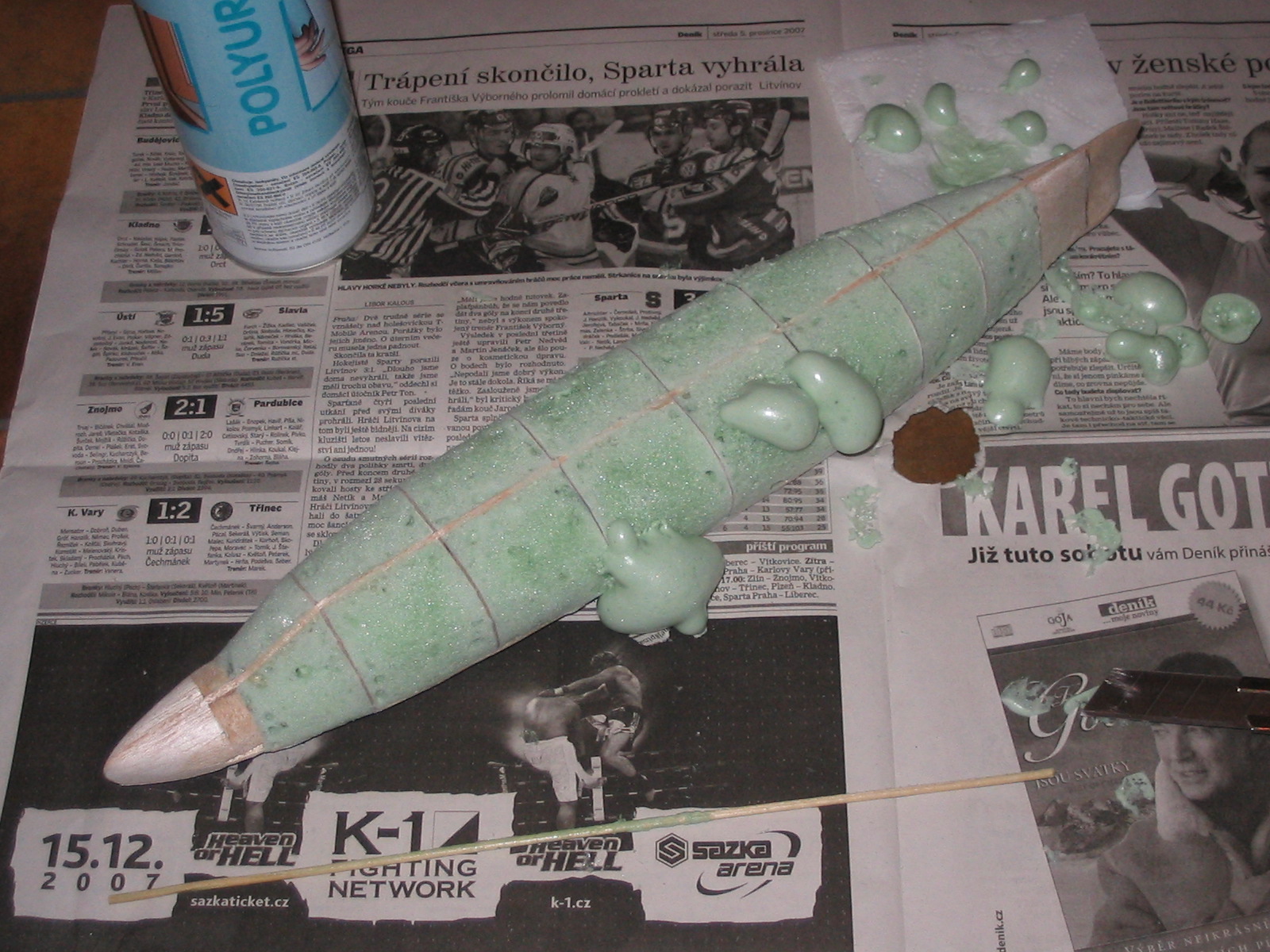 Zajímavou a efektivní technikou je vyplňování kostry trupu pomocí montážní polyuretanové pěny. To co při použití pevného materiálu trvá hodiny, lze takto zrealizovat v pár minutách. Na první pohled velice lákavá představa ovšem i v tomto případě platí, že všechno má svá pro a proti. PU pěna je běžně k dostání v obchodech se stavebními potřebami, drogeriích apod. v podobě sprejů. Její aplikace je velice snadná a rychlá, pěna se prostě nastříká na své místo a nechá ztuhnout. Pěna tuhne působením vzdušné vlhkosti, proto není vhodné ji jakkoli zakrývat. Při aplikaci je dobré dávat pozor na tloušťku vrstvy. Pokud je příliš velká (více než několik cm) tak hrozí, že pěna uvnitř neztuhne a při následném opracování bude dělat potíže (zalepení řezného a brusného nástroje). Větší trupy je tedy lépe vyplňovat na několikrát, anebo pěnu aplikovat pouze po obvodu žeber. Pěna se při tuhnutí značně rozpíná a díky tomu vyvíjí na své okolí určitý tlak. Deformací kostry se však není třeba příliš bát, protože tlaky působící z obou stran přepážky se navzájem vyruší a navíc má pěna možnost expandovat mimo trup do volného prostoru. Vzhledem ke značnému nárůstu objemu je vhodné pěnu aplikovat zdrženlivě, aby se předešlo zbytečnému množství odpadu. Vytvrzená pěna má jemně porézní strukturu, bohužel se však v ní často vyskytují větší bubliny. Jejich přítomnost lze údajně omezit zamačkáním čerstvě zatuhlého povrchu pěny do ještě plastického vnitřku. Jinak lze díry v pěně zaplnit její opakovanou aplikací, menší nerovnosti pak tmelem. Nejvhodnější k tomu je zřejmě tmel šlehaný.