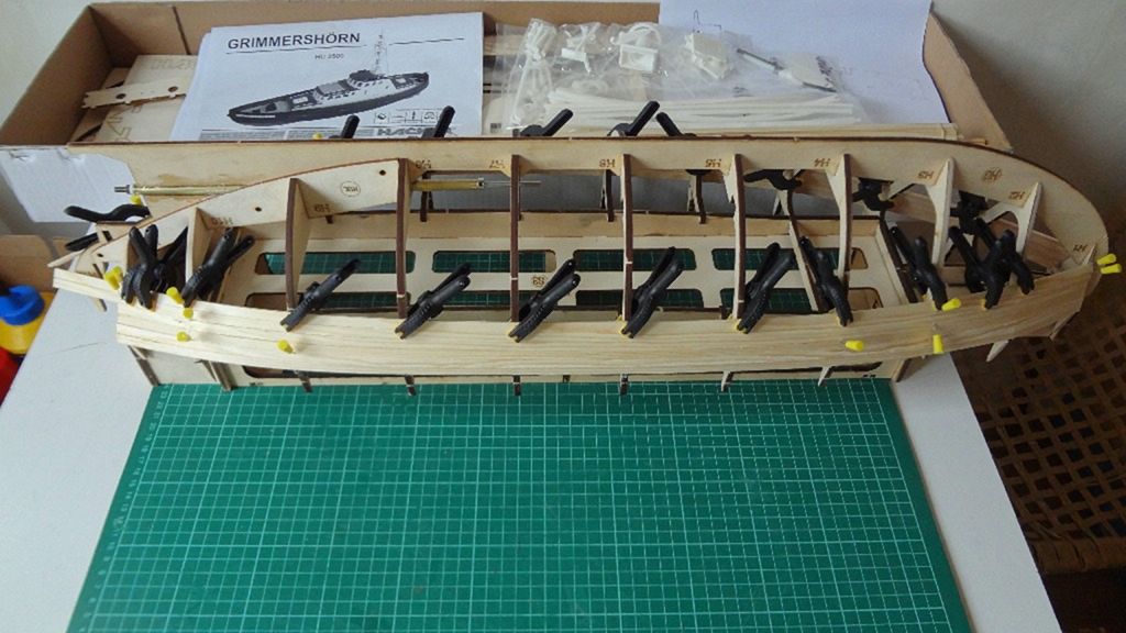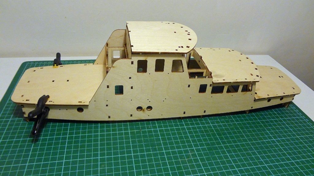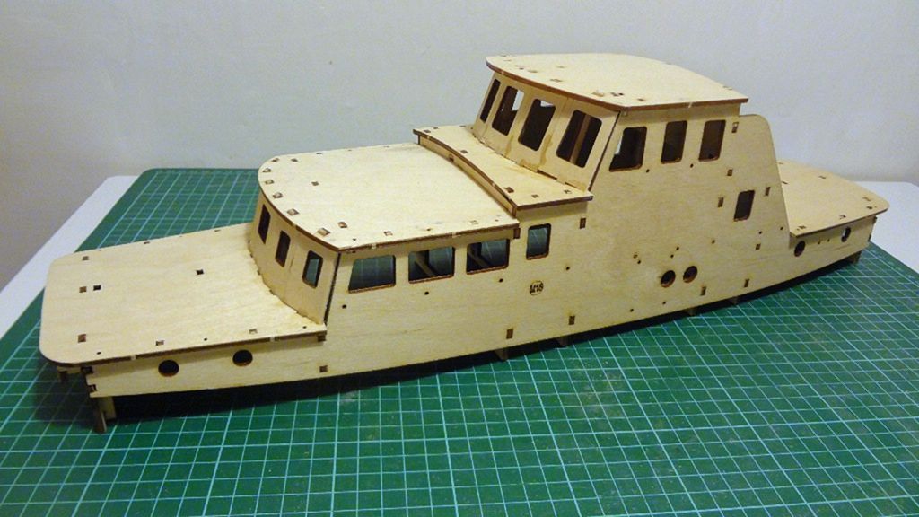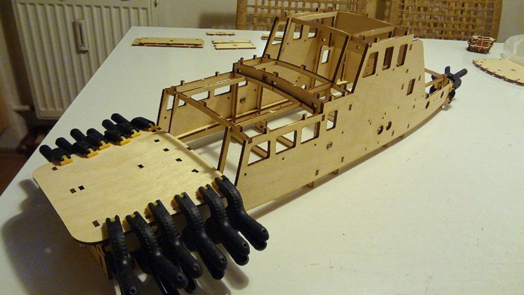 Nyní je na řadě nástavba, ta je kompletně zhotovena z topolové překližky 3 mm. Možná to je trošku „retro“ přístup, dnes je spíš zvykem používat plastové desky a různé profily, ale my chceme dřevěnou loď… Nejprve si připravíme kostru budoucí nástavby, ta mi přijde velice subtilní, nicméně bez potíží k této konstrukci lepím obě bočnice, které je třeba prohnout.