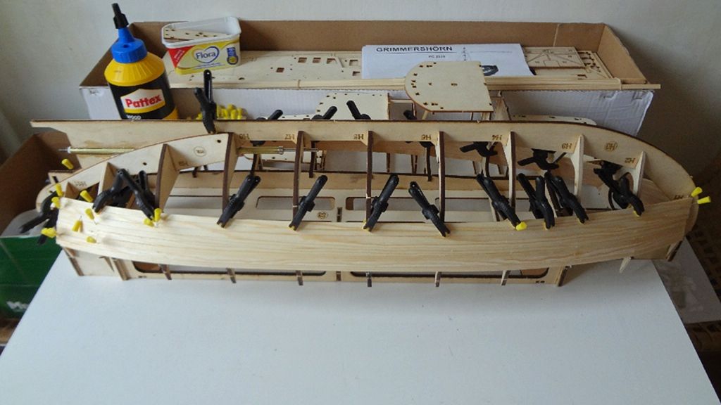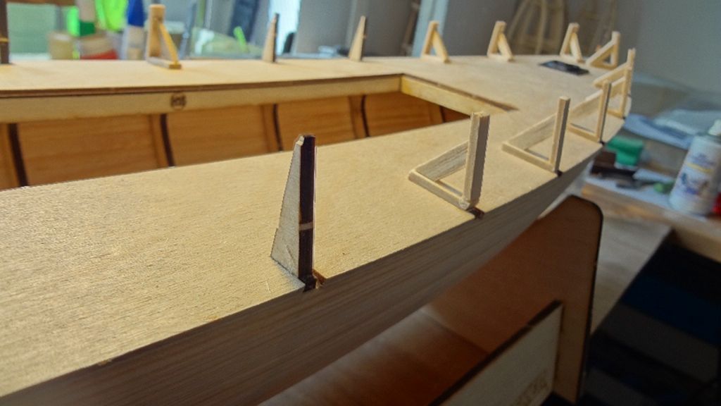 Na tuto palubu pak přijdou nalepit balzové lišty 2x7 mm, které tvoří bort lodi. Ty lepíme k pomocným výstupkům žeber a boky k sobě, výstupky později odstraníme, jde to dobře díky naříznutí výstupků v rovině paluby. Já jsem měl složitější situaci, protože moje stavebnice měla žebra s příliš velkým naříznutím a tak jsem výstupky nechtěně předčasně odlomil. Proto jsem musel vyrobit náhradní podpěry.