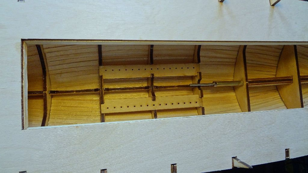 Do vnitřní konstrukce trupu postupně přijde vlepit budoucí lem otvoru paluby a také zkompletujeme skluz kotevního řetězu s vodícími trubičkami, pro které dle šablony vrtám otvory v bocích (já jsem tento díl i předem nastříkal černou barvou). Pro impregnaci vnitřku lodi jsem vše uvnitř vytřel laminovací pryskyřicí. Poté už uzavřeme trup první „pracovní“ palubou.