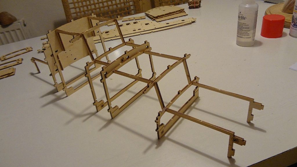 Poté je třeba lepit jednotlivé vodorovné prvky. Zde mi přišlo, že je vhodné díly střechy předem prohnout, tak překližku namáčím a v prohnutém stavu suším na topení. Stejně tak ale zkouším lepit předem neohýbanou střechu a jde to také bez problémů.
