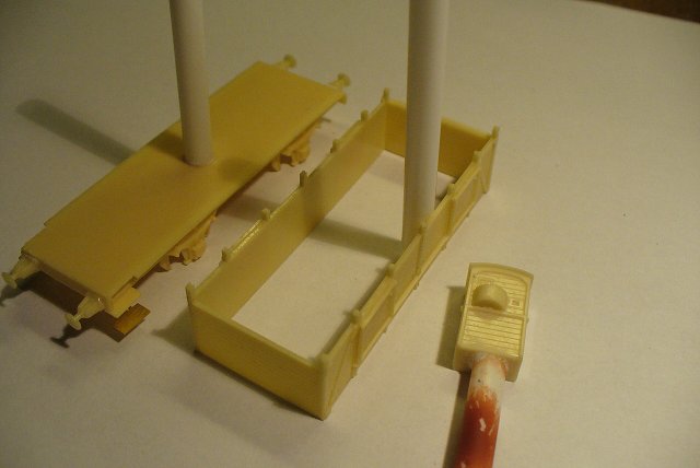 Následovalo sesazení dílů. Nejdřív jsem nalepil korbu na pojezd, potom leptanou podlahu a na ni brzdařskou budku. Nakonec