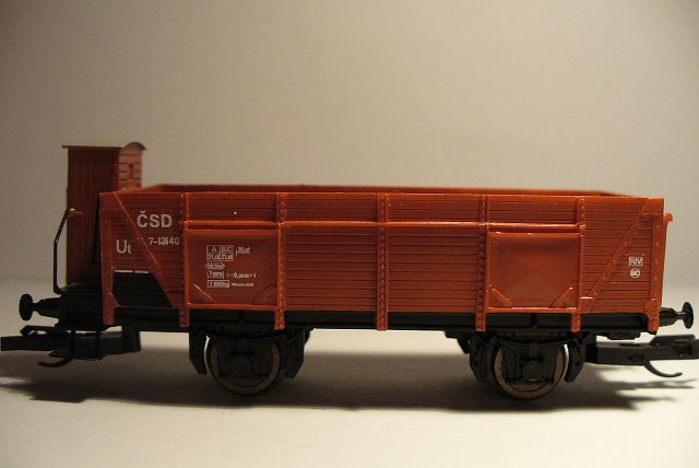 Díly po nástřiku, podvozek polomastnou černou, korba a brzdařská budka červenohnědou vagónovou a dvojkolí lehce rzí.