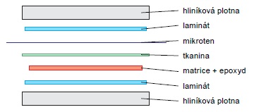 Tolik popis a teď jak na zhotovení. Nejvíce se mi osvědčil materiál z tabulek „Zde soutěží kolektiv o titul BSP“. Jsou tlusté a z kvalitního, trochu tvrdšího plastu. Z tabulky uříznu pásek o rozměrech minimálně 160x60 mm a na něj měkkou tužkou narýsuji rozměr plátu - zde bude naznačen svar. Vně těchto čar vynesu body budoucí sítě, podle měřítka to vychází přibližně 1x1 až 1,5x1,5 mm. Pak postupně rýsuji síť a v průsečících čar opatrně vrtám mělké jamky. Ve staré pentelce mám vrták o průměru 0,6 mm a je potřeba vrtat opravdu lehce. Jedna, maximálně dvě otočky. Vyzkoušel jsem to i prodávaným ručním vrtáčkem s výměnnými kleštinami, ale jamky byly příliš hluboké a výsledný povrch značně nerealistický. Dá to práci, ale pokud vydržím, tak za dva, tři večery mám matrici hotovou. Umyji stopy tuhy a naseparuji vazelínou, kterou nanesu lehce prstem - přebytečnou z jamek dostanu starým štětečkem s velmi zkrácenými chlupy. Matrici mám položenou na naseparované podložce (odřezek laminátu). Namíchám trochu epoxidu a rovnoměrně v tenké vrstvě jej nanesu na matrici. Na epoxid položím ústřižek skelné tkaniny. Musí na všech stranách trochu přesahovat! Přitlačím a dávám pozor, aby někde nezůstala vzduchová bublina. Pak přijde mikrotenový sáček a uzavírací plát laminátu (stačí tabulka). Tento sendvič pak zalisuji mezi dvě duralové plotny a stáhnu lehce (!) svěrkou (viz nákres). Pokud si vzpomenu, příští den ráno, než odejdu do práce, lis rozeberu, opatrně odtrhnu tkaninu od matrice, položím na rovnou plochu a nechám aspoň dva dny vytvrdit. Pokud zaspíte a výlisek budete vyjímat později, buďte velmi opatrní, některé bobky mohou zůstat ve formě. Ta se dá sice převrtat, ale je to zbytečná práce a plát většinou putuje do koše.