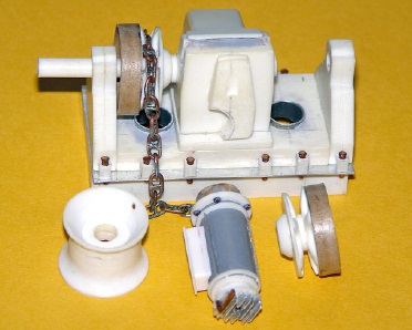 Vezmeme-li to od přídě, je nyní na řadě kotevní naviják. Na ně opět používám oblíbené tabulky, z nichž slepím kostru navijáku, ve vrtačce vytočím bubny a pak nastoupí piplavá práce s koly, která hýbou řetězem. Je dobré, když vzdálenost mezi jednotlivými paprsky na tomto kole a velikost samotných paprsků je shodná s velikostí ok kotevního řetězu. Oko řetězu, které je ve vodorovné poloze, musí zapadnout mezi dva sousedící paprsky a následující článek přijde do mezery mezi dva protilehlé paprsky. Složité? Podívejte se na fotografii, případně do kvalitního výkresu.