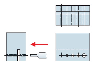 Z kusu železa mám zhotovený přípravek (viz obrázek). Otvory v něm mají průměr od 0,6 mm až do 1,5 mm. Napříč jdoucí zářez má tloušťku materiálu, ze kterého se vyrábějí podložky do kancelářských složek. Přípravek ve svěrce dám do stojanu vrtačky a do sklíčidla vrtačky vložím zabroušenou stopku zlomeného vrtáku odpovídajícího průměru. Pak již razím jednu hlavu nýtu či šroubu za druhou (je potřeba jich udělat minimálně 50 % navíc). Tyto „hlavičky“ pak lepím na již kompletně hotový povrch modelu. Na nesavou podložku kápnu trochu disperzního lepidla Herkules. Ocelovou pinzetou vezmu jednu hlavičku a na její spodní rovnou stranu špičkou jehly nanesu trochu lepidla. Potom už se jen musím trefit na místo určení. Čtyři, šest, osm hlaviček lepím od oka. Pokud je jich víc, naznačím si měkkou tužkou jejich pozici. Když Herkules zaschne, trochou barvy odpovídajícího odstínu přilepené hlavičky ještě přetřu. Pozor - jen lehce! Hlavička musí získat potřebné zbarvení, ale barva ji nesmí zalít, její hrany musejí zůstat ostré. Práce je to piplavá a kupodivu nejhůře jdou ty poslední hlavičky.