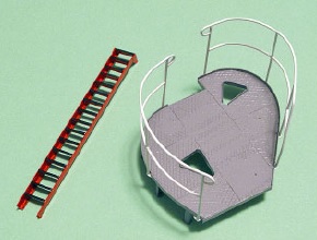 „A co když je tam někde zatáčka, promiňte, ohyb?“ Postupuji stejně a zábradlí nakonec opatrně ohnu kolem kulatiny vhodného průměru. Chce to opravdu opatrnou práci, ale jde to! Pokud by se vám při ohýbání nevedlo, budete potřebovat další ruce ke chlazení pájených částí. Tedy nejdříve natvarovat a pak pájet. Stačí obyčejné ploché kleště nebo pinzeta, a samozřejmě, výkonná mikropáječka. Na tom papíře klidně vystačíte s obyčejnou pistolovou. Nesmíte zapomenout, že pokud je vodorovná část zábradlí menšího průměru, prochází vždy středem sloupku. Je tedy potřeba podložit tyto příčky již před lepením a tak dostat příčku přesně na střed sloupku (stačí složený papír). Na své první pořádné maketě Paolo-M jsem měl dokonce sloupky zábradlí vrtané! Samozřejmě v přípravku. Pak není potřeba pájet. Stačí zakápnout kyanoakrylátovým lepidlem nebo barvou.