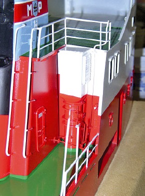 Když již máme hotový trup a nástavby, je potřeba také myslet na zábradlí. Posádka či cestující nemohou přece jen tak padat do vody. Základem je opět měděný drát získaný z nějaké cívky, trafa atp. Drát nejdříve opravdu důkladně očistím a narovnám. Podle výkresu si tvar zábradlí nakreslím na papír. Dobře poslouží čtverečkovaný. Nyní jednotlivé části (začínám od stojek) hnědou lepicí páskou přilepím na nakreslený vzor. Je dobré konce drátu aspoň zarovnat pilníkem, dost pomůže, pokud zhotovíte osazení. Pak již jen pájecí kapalina a můžete tvořit. Pozor, je potřeba udělat celou část najednou! Pokud při kontrole druhé strany zjistíte nějaké nedostatky a chystáte se je opravit, nebuďte líní a zase lepte! Dále již stačí jen odstranit přebytečný cín a můžete barvit.