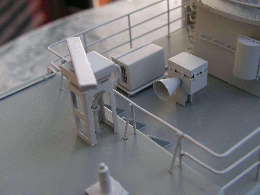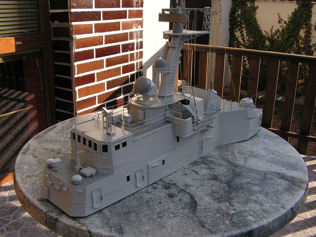 Základna stožáru je opět z laminátových desek 0,76 mm. Samotný stožár je vybroušený z extrudovaného polystyrenu podle šablon, olaminovaný třemi vrstvami tkaniny cca 80 g. Po olaminování jsem polystyren odleptal pro jednodušší protažení kabelů pozičních světel. Horní platforma je z kombinace laminátových desek 0,76 a 0,2 mm. Vyhledávací radar „garpun“ má tělo vysoustružené ve vrtačce z násady od smetáku a parabolu slepenou na šabloně z pásků laminátu 0,2 mm.