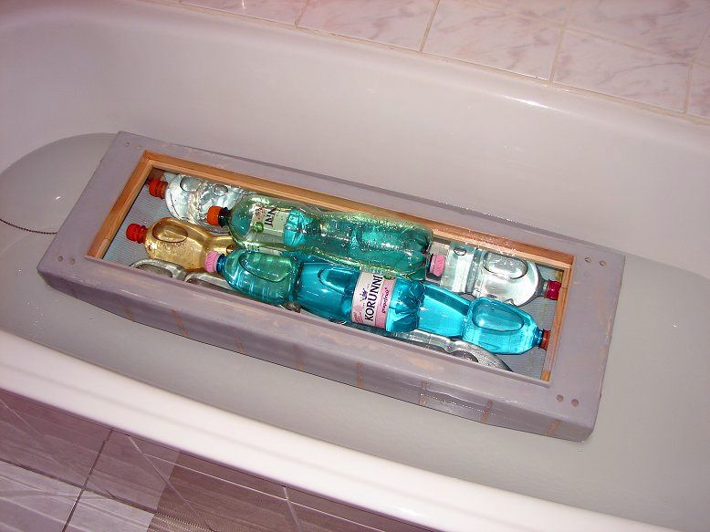 Vnitřní prostor vany byl dimenzován podle PET lahví, které slouží k nabrání vodní zátěže. Na dno se vejdou čtyři dvoulitrové, dvě jedenapůllitrové a půllitrovka napříč doprostřed na zajištění. Nad nimi mohou být čtyři další jedenapůllitrovky, což dádá maximální zatížení asi 18kg plus čtyři kila samotná vana. Její maximální výtlak je asi 25kg, přičemž nepotopitelnost i za této situace zajišťují polystyrenové bloky ve špicích.