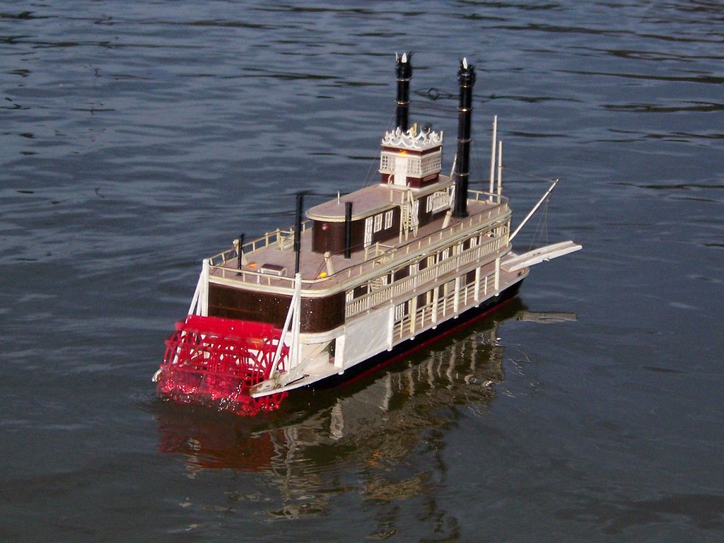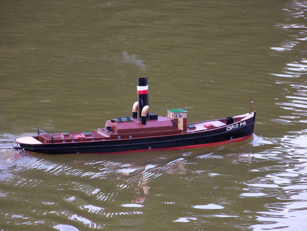 Shodou okolností se mi povedlo přemluvit pár kolegů z KLoM Písek, a tak byl můj vůz po dlouhé době naložen až po okraj. Jelikož Jiří Voráček bydlí poblíž Lán, neodolali jsme malé exkurzi do loděnic žijící modelářské legendy, kde vznikají modelářské parní strojky, kotlíky a parníčky. Protože jsme dorazili příliš brzy, nestihl však připravit parníky k vodě, a tak vyrazil s osvětleným exparníkem. Tuším, že jde o Kirishimu.