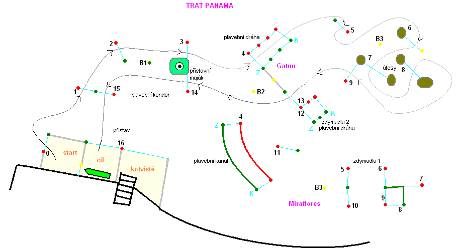 se remorkéry nesmí dotknou vjezdových majáků, které tvoří branku 0. Spulodí postupně propluje brankami 1,