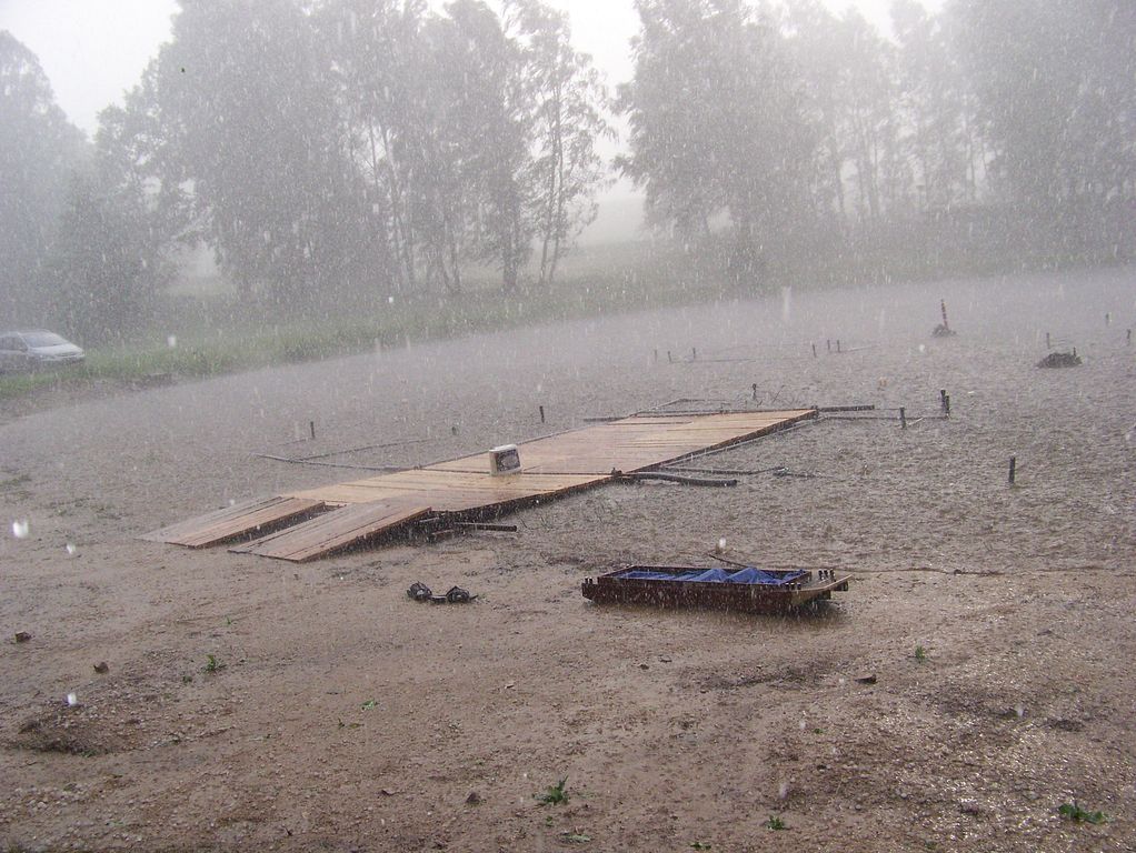 Během několika okamžiků ve vojenském stanu zmizely modely lodí, vleky na těžký TT. Poslední vbíhali do stanu již za tmy, krupobití a opravdu hodně silného větru. To, co se strhlo potom, asi nezažil ještě nikdo z nás. Kroupy o průměru 2 až 3 cm mlátily do stanu, se kterým lomcoval silný vítr a který jsme drželi u země, aby ho vítr nepodfoukl. Kdo držel, několik tvrdých ran schytal. Okýnka ve střeše se otevřela a kroupy začaly prolítávat dovnitř. Moje manželka s pesanama se musela schovat pod stůl. Rachot byl uvnitř takovej, že jsme na sebe museli křičet. Kromě toho, že jsme se neslyšeli, jsme se pro tmu taky neviděli. Stihli jsme ještě zakrýt RC vysílače, což je asi zachránilo. Vítr totiž do stanu pumpoval vodu každým otvorem, a tak "trochu" pršelo a kroupovalo i uvnitř.