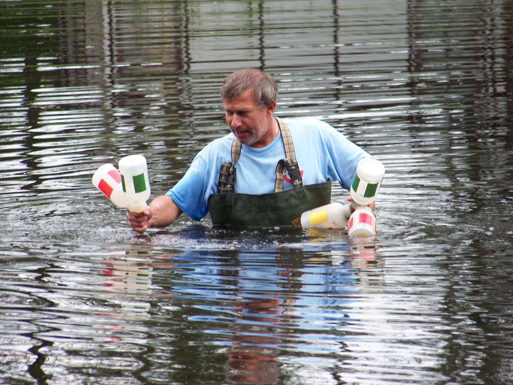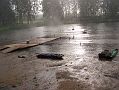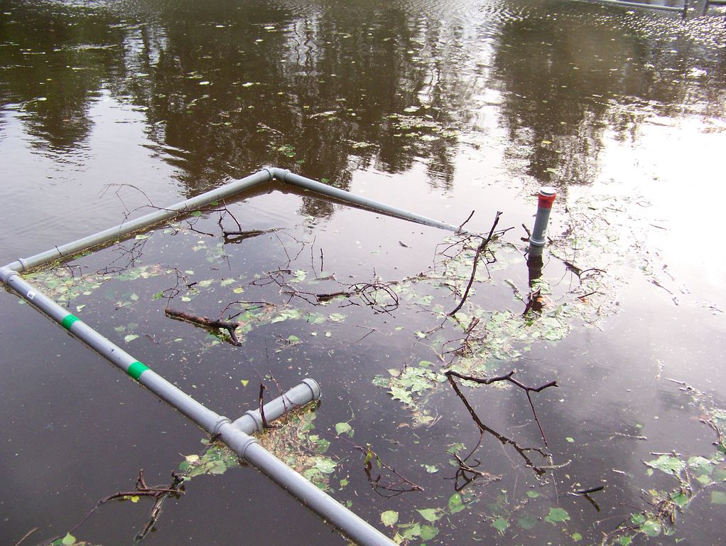 Hladina rybníka se zvedla tak, že skoro ze všech bójí vystupovaly nad hladinu jen vršky. Skalisko a majáky byly odrbaný, jako by je někdo odstřeloval a druhý den při úklidu jsme posbírali hodně kusů montážní pěny. Bylo nám jasné, že budeme mít zase co dělat. Naštěstí velký vlek a plošina byly bez úhony, stejně jako modely remorkérů. Co bylo ale nejdůležitější, byl fakt, že všichni to přežili ve zdraví. Pouze Msob ležel v pokoji s horečkou z vedra.