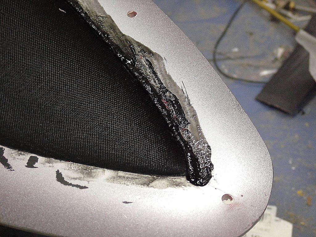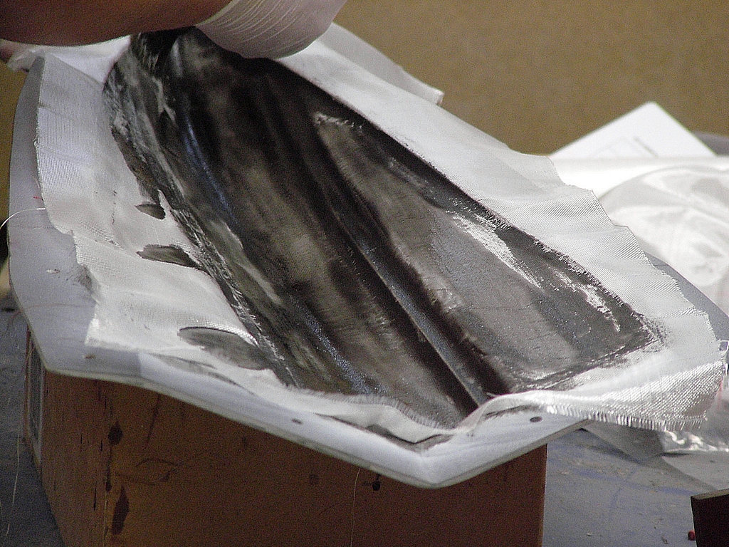 Jako první, se důkladně vymažou všechny hrany formy zahuštěnkou. Tím jednak zpevníme hrany na výsledném výrobku. Ale také si tím zjednodušíme kladení tkaniny, která by se nám do těchto rohů nedostala a pokud by se zde vytvořila vzduchová bublina, velice snadno by se daný roh ulomil. 80 g/m2 skelnou tkaninu budeme mít nachystanou tak, abychom ji mohly nanést v jednom kuse do formy, a pak ji důkladně prosytíme iniciovanou epoxidovou pryskyřicí. Zkušenosti zhotovitele se odrazí na množství použitého epoxidu a výsledné hmotnosti celého produktu. Dále musí zhotovitel dbát na to, aby se mu nevytvářely pod tkaninou vzduchové bublinky, které by celý výrobek znehodnotily.