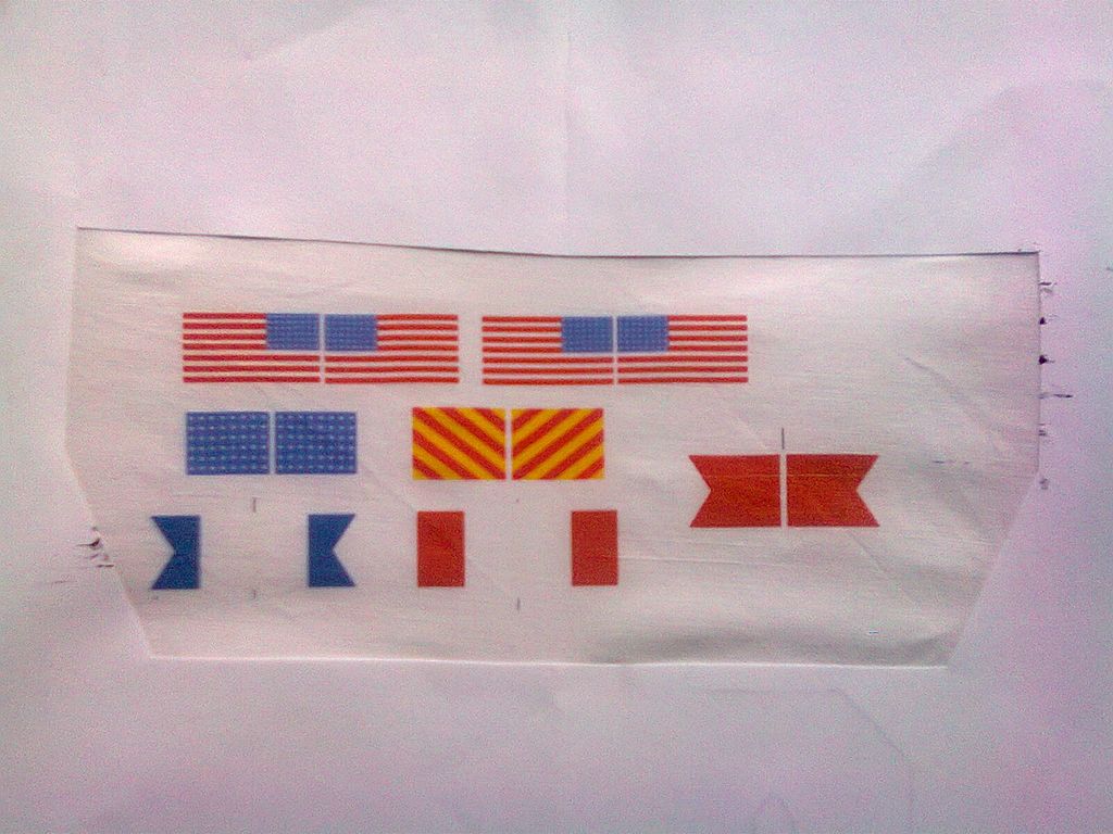 Zde jsou hotové vlajky. Jak jsem psal v úvodu, mají drobné nedostatky. Vlajky slepím na lanoví nejspíše Herkulem a nalakuji je.
