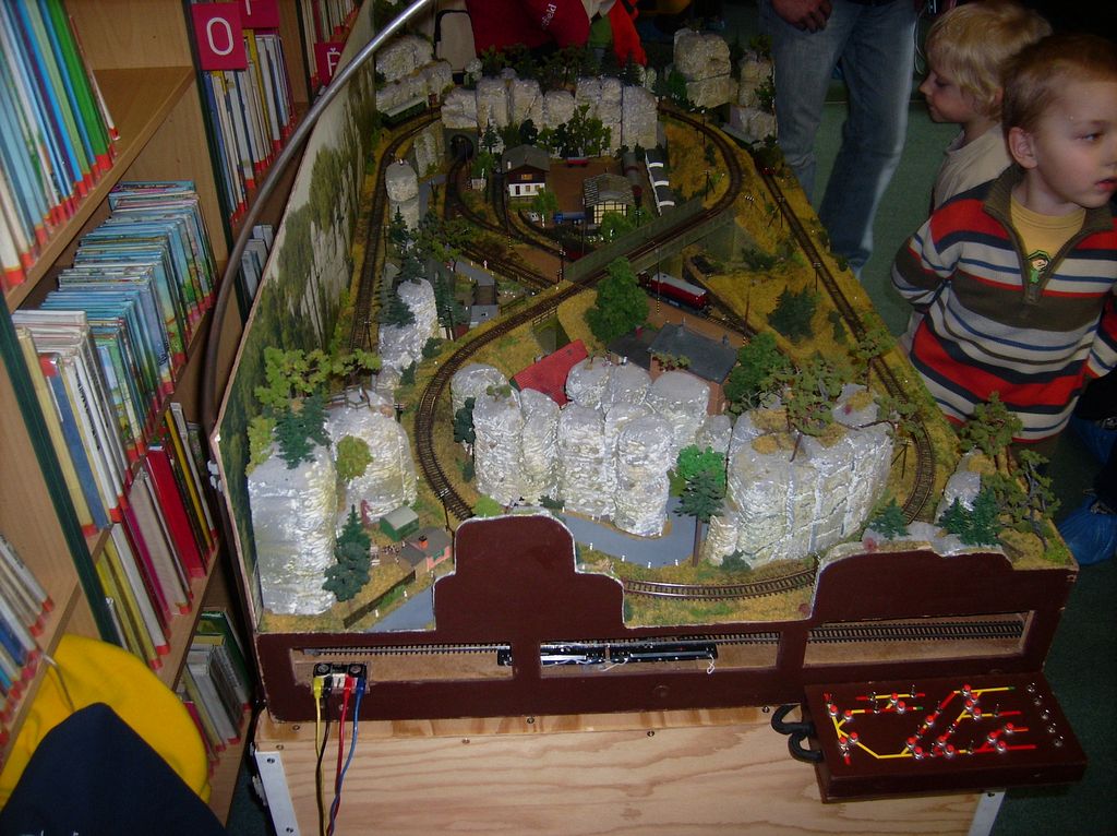 Modelovou železnici jsem viděl naposledy někdy kolem roku 1985, takže železnici s větším rozchodem kol než v té době běžným jsem viděl poprvé v životě (asi jde o velikost O?). Ta mne zaujala nejvíce i díky rozličným efektům. Např. při brzdění vlaku realisticky pískaly brzdy. Vagony byly mezi sebou spojeny nejspíš magnetem (žádný háček a naproti dírka). Stálo za to počkat si na spuštění parní lokomotivy, která mě absolutně dostala svojí realistickou funkčností. Mám pocit, že nejenom charakteristický zvuk parního stroje ale i kouř z komína se měnil podle rychlosti jízdy. Hustota kouře byla dle mého názoru zcela měřítková.